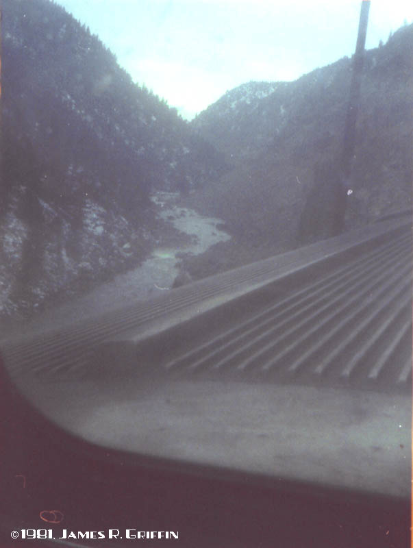 Here is one of the few decent views of the train in the canyons. Yes, those are dead leaves on the roof of our car. Little Gore has several short tunnels through rocky spurs, with miles of slide-detection fencing between. The Colorado River is an unremarkable mountain stream at the bottom of the defile in this region.