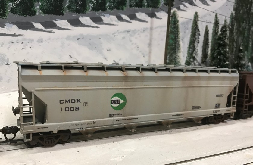 4. Rust. This can take many forms and degrees. I haven’t done much with heavy rust, but I find that covered hoppers frequently display some streaks. As shown above, I originate many streaks from the attachments on the roof. I use a brush to stripe down with ochre paint, dragging down vertically. Some of the wash collected along the stiffener ribs, which is just fine. I also reinforced this with a bit of darker grime, carefully applied with a drybrush and reinforced with the airbrush. Also pay attention to welded seams on the carbody; often those display a streak of rustiness. I have seen people create rusty scratches on cars using oils and other techniques, but I’m going for quick-and-dirty, literally.