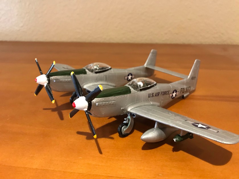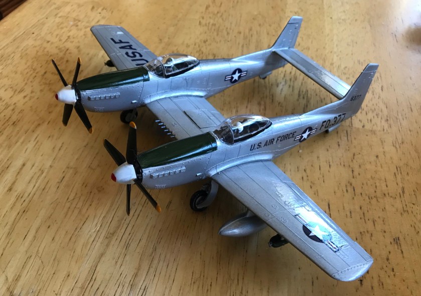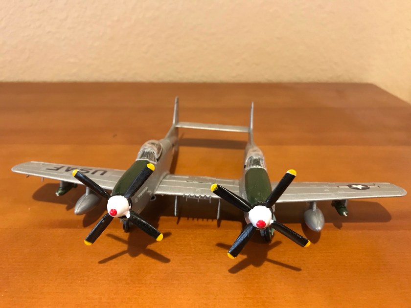 But then… a couple of Christmases ago, the family found a bunch of kits on clearance at Hobby Lobby, including a Revell kit of what is indubitably one of the strangest planes ever built– the F-82G. It ended up under the tree with my name on it. On the outside the F-82 Twin Mustang basically looks like a pair of conjoined P-51’s, though it had a number of systems upgrades and changes that made it quite different. These were the last American propeller-driven fighters designed before the advent of jets, and served in Korea.