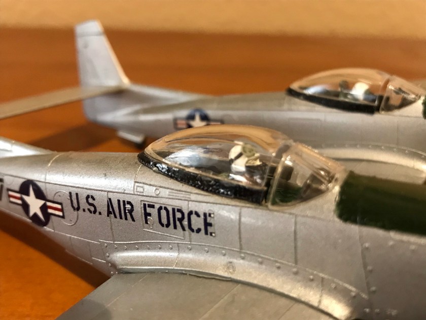 All that said, here’s what I did. I sprayed all the outer surfaces with Testors aluminum. I made my own zinc chromate by blending shades of craft-store acrylics. I pondered that choice for a while since there’s more risk of damage, but it turned out to be so satisfying that I used it for the anti-reflective panels on the noses as well. Anyway, I used the chromate color inside all the wheel wells and inside the gun panel. I followed the usual assembly steps, touched up the paint as mentioned, and occasionally cursed the people who wrote the instructions.