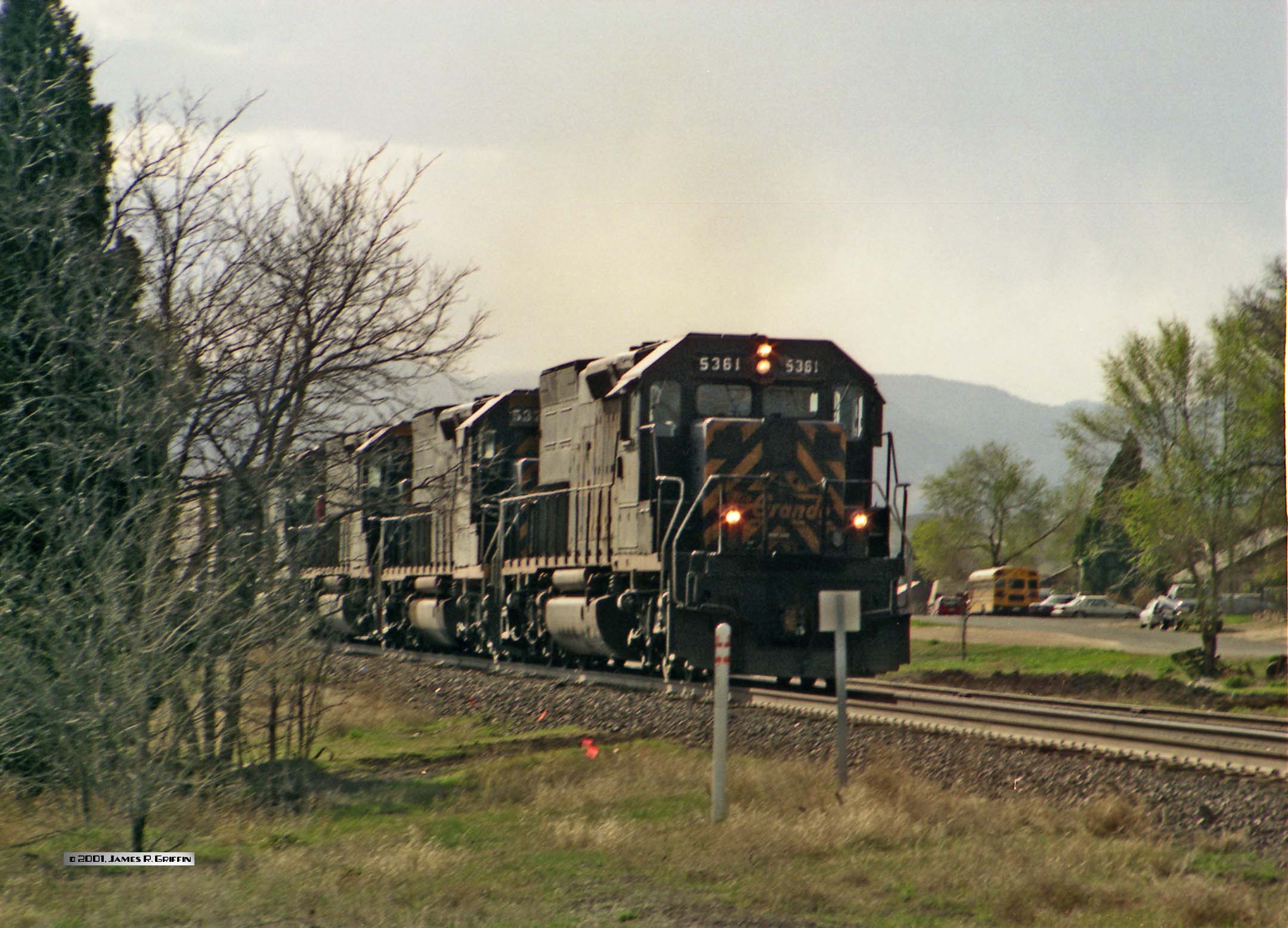 Last in line was Southern Pacific No. 8532, an increasingly-rare sight in 2001– even more so since it was still in its original paint. It was delivered in December 1978, making it the youngest of the four. It only looks oldest! Look high on the end and you can see where the railroad removed the distinctive SP light package.