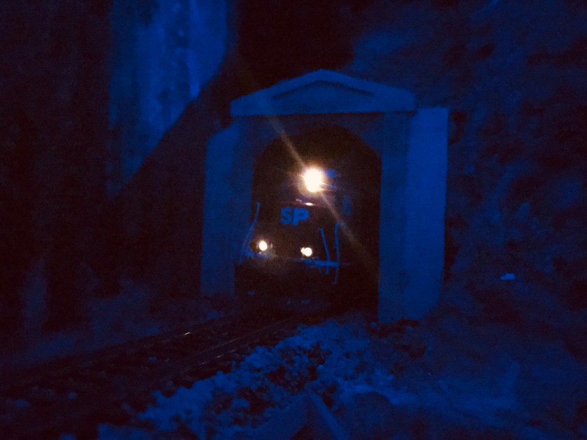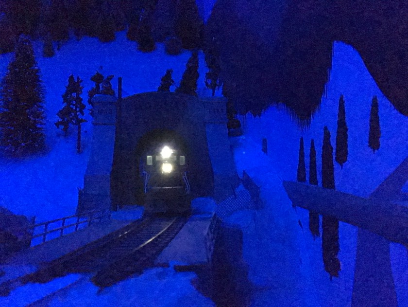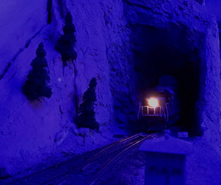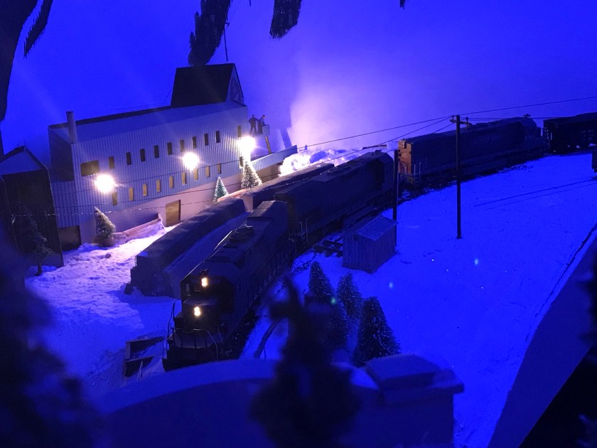 My layout occupies half of the garage. My wife’s car occupies the other half. She doesn’t have to scrape frost in the winter. I get a double-deck model railroad. Fair trade, we think. Anyway, my half also stores boxes and boxes of things, requiring shelving– which happily provides a place to string lights for daytime ops. Night ops are different. In the photo above you can see the string of lights, haphazardly strung on whatever I could hang them from. Why so? Because frankly, nobody ever looks up. Plus, I wanted the ambient blue light to fill in every scene on the La Plata Division.