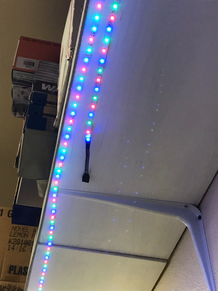 Remember that valance I mentioned earlier? Well, there is a string of multi-colored LEDs installed up there in addition to the daylight lights. These can be adjusted by color and brightness for additional effects, with a convenient remote control.