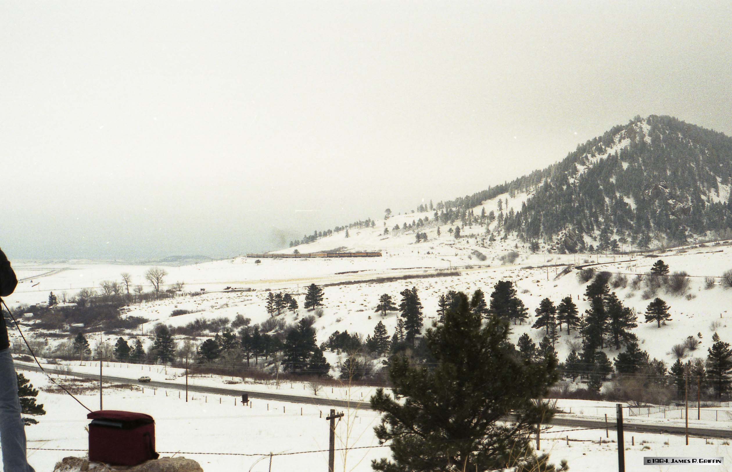 Eight days later we were back, on the opposite side of the valley. It is hard to believe from the photos that the dates were that close together, but such is springtime on the Front Range. It was Sunday afternoon and I wanted another shot at the train with the good camera. Little did I know how lucky I was, that it would be running on April 8th– and that this was the last run of the season. More importantly, it was the very last run (ever) of the F9 set on the Ski Train, or any other passenger train. SEE HERE FOR A VIDEO OF THIS TRAIN EARLIER IN THE DAY. |