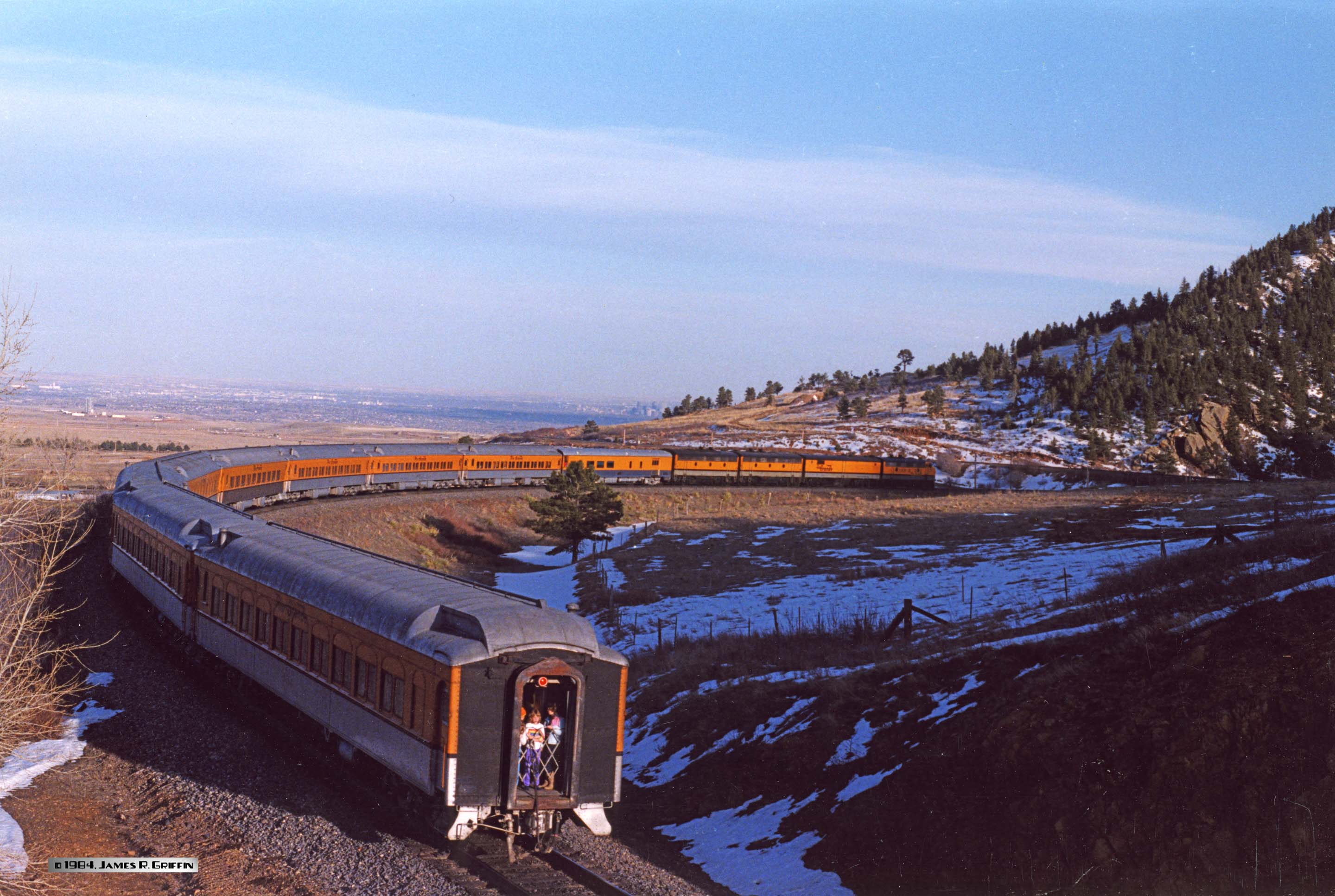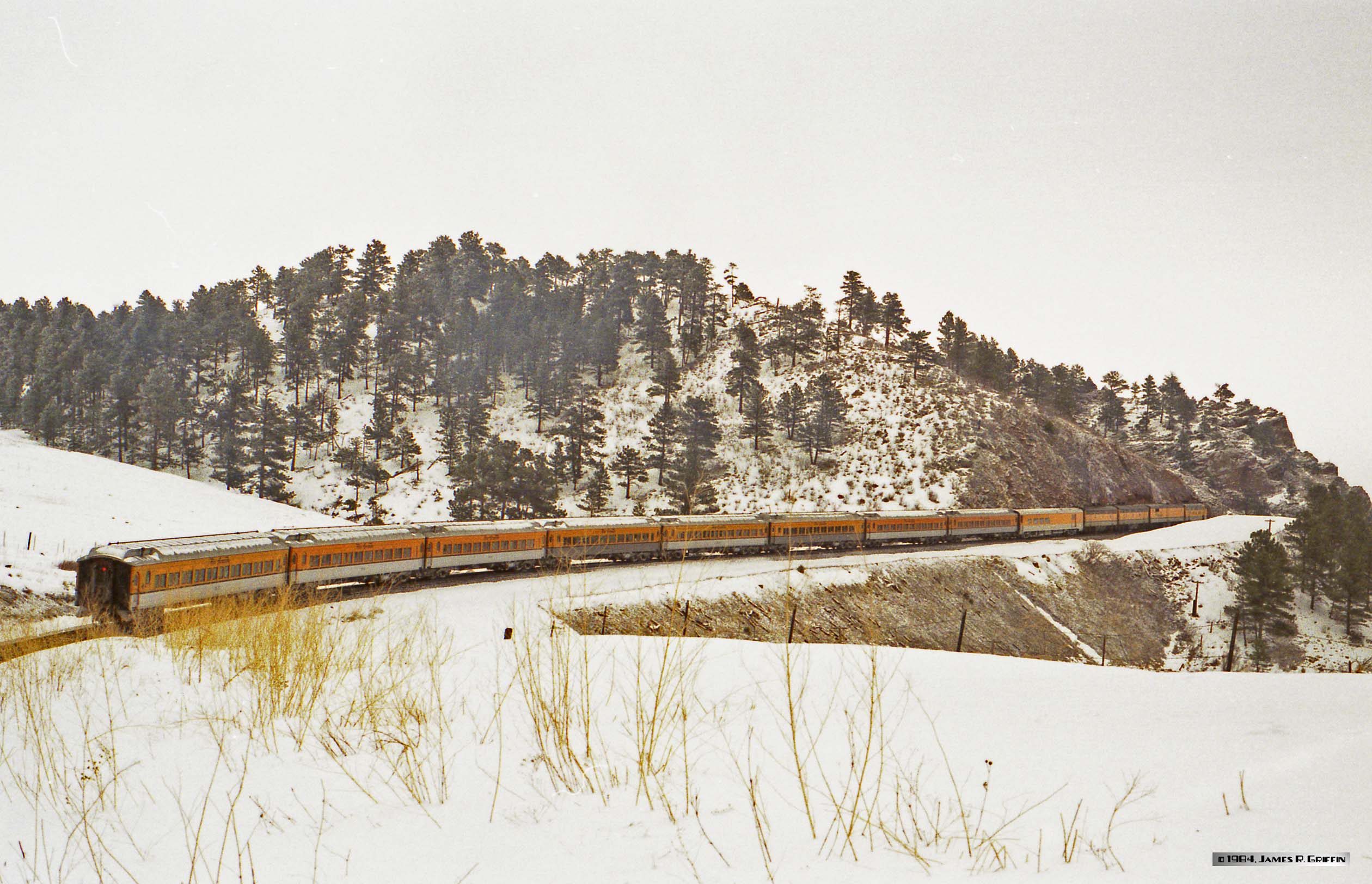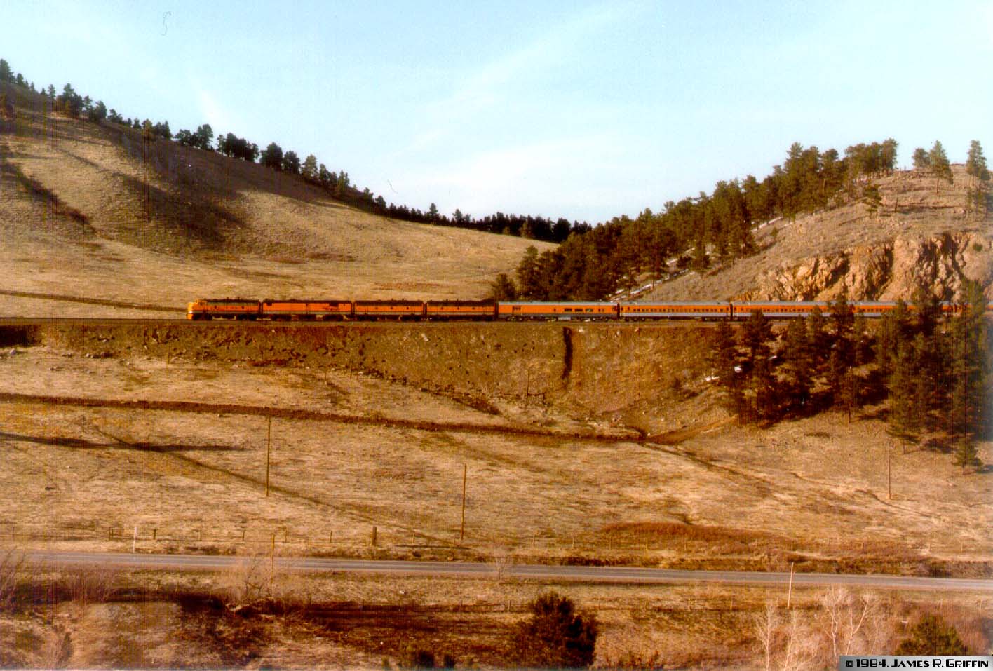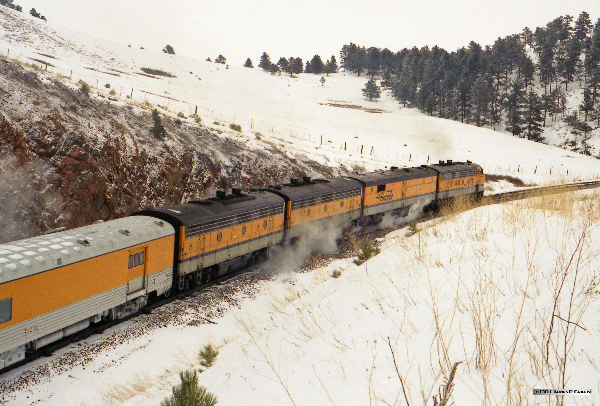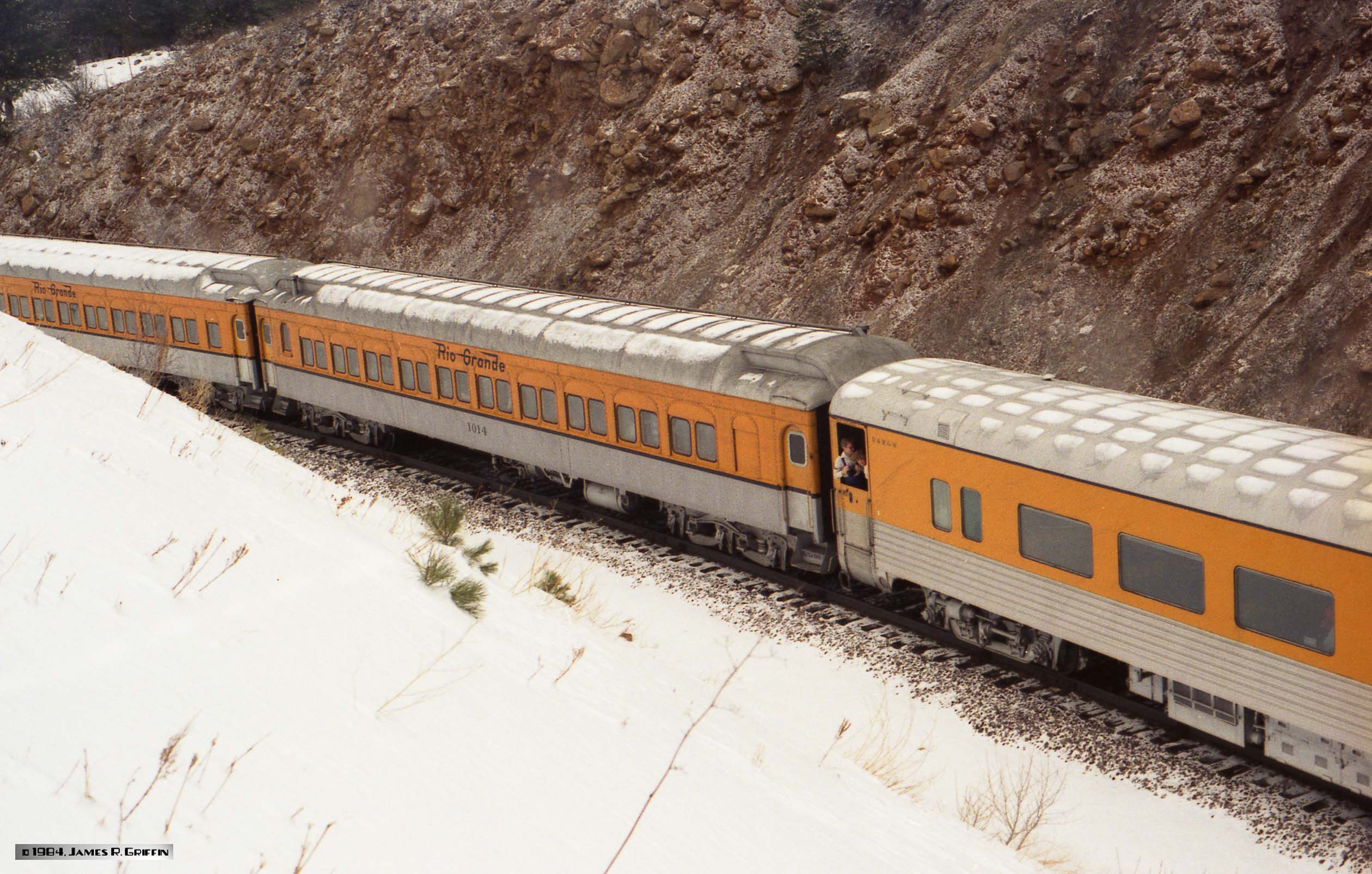 Aesthetically pleasant, these three were tapped for assignment pulling the RGZ, which was inaugurated when the D&RGW refused to join Amtrak at its creation. For the next dozen years they served faithfully in that service, until the eventual cancellation of the Zephyr caused the F9’s to become surplus. Nearly 30 years old by now, and with far less power than contemporary front-line locomotives, the beloved trio was shuffled off into work-train service, grinding over Tennessee Pass with heavy loads of slag for most of 1983. But– there was to be one last season of respectability in store for them before retirement.