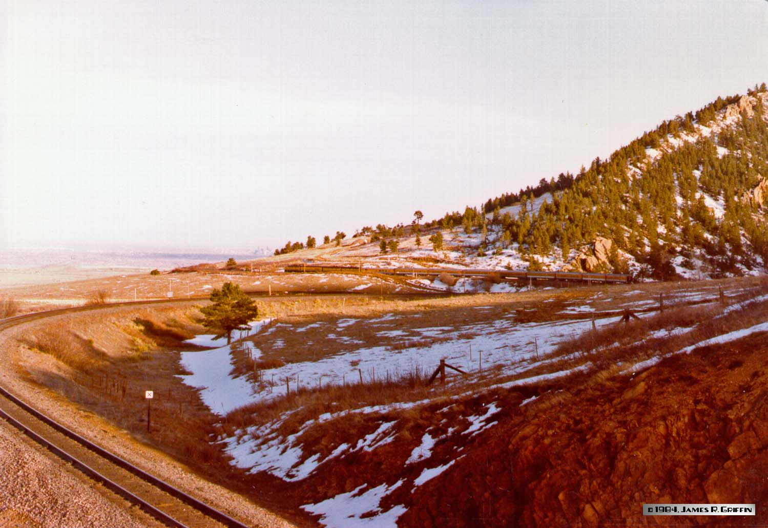 A quick swivel to the right and we see the head end, working up the hill towards Tunnel One. Actually, this view exactly replicates the erstwhile Rio Grande Zephyr in terms of equipment. |