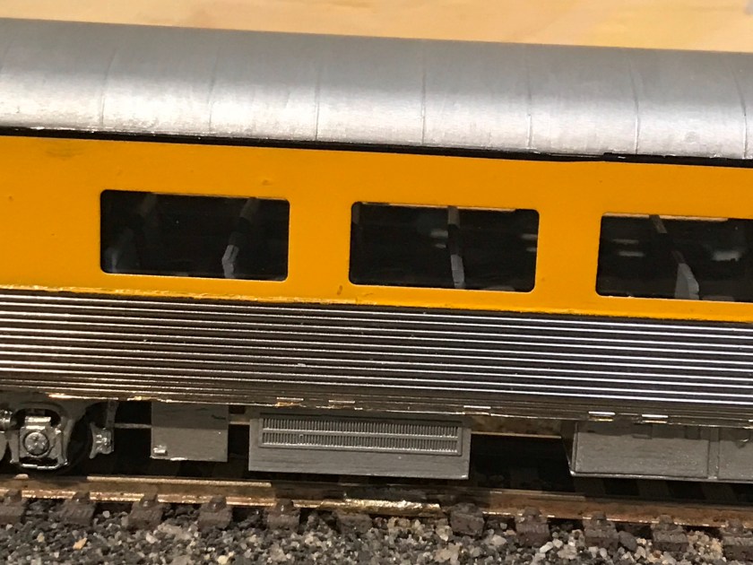 Finally: a substitute diner. The ex-CZ diner SILVER BANQUET was heavily utilized during the RGZ‘s tenure, and it began having issues to the point that the D&RGW picked up a former Union Pacific diner to protect it. This ACF diner was refurbished and repainted, but was never actually lettered with the number it was assigned (1116). The car was used for several months during late 1981, but that was pretty much all. I modeled it to provide variety, and because it was on the train the first time I rode it. Modeling it was actually quite easy, since the Rivarossi diner is an exact match. It required very little lettering and only one stripe per side.