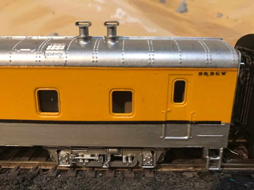 The two combines were Nos. 1230 and 1231, initially identical. This one is No.1230. I built it from etched carsides by Nickel Plate Products commissioned by the Rio Grande Modeling & Historical Society, detailed and built onto a car core kit, with many added details. I had to remove the skirts to make it accurate for this period. (I have also kitbashed a version of 1231 after the small dorm windows were removed, but it’s not quite up to these standards of detail.)