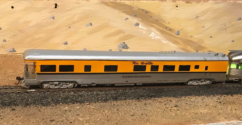 Now, the tail end. In the early 1950s the railroad had converted a P-S coach into a classy business car. During the 1970s and early 1980s the Wilson McCarthy was often tacked onto the rear of the RGZ. In fact, during my time of chasing and riding the train it was essentially a fixture. I have wanted to model it for decades. I finally scored a brass version, my one serious model extravagance. I had the unpainted car sandblasted, then painted and lettered it using decal art that I created.