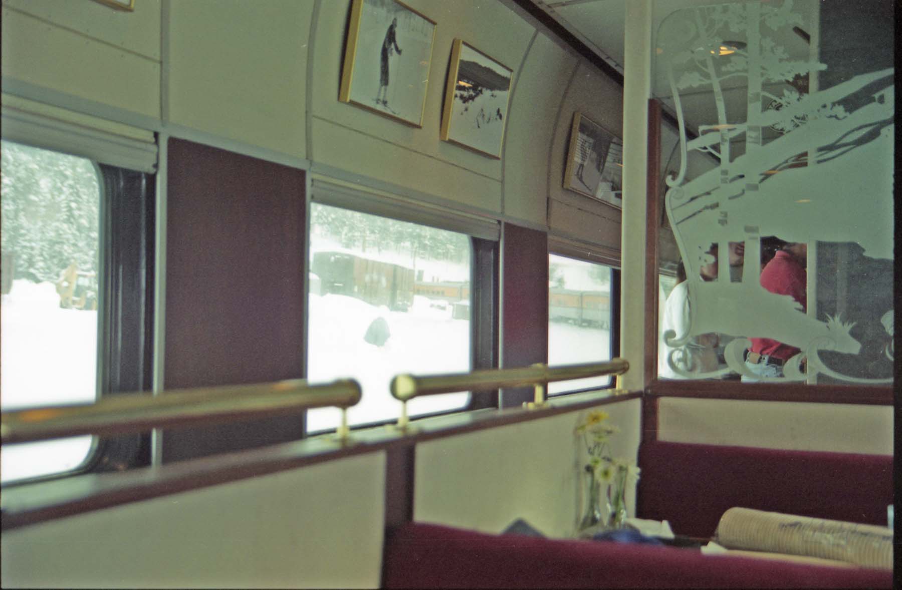 Now for an anecdote. We were sitting in the cafe car right where I took that interior shot, all having our cocoa and such. Our kids were 11 and 8 at the time. The younger one was just taking a sip of cocoa with its whipped cream topping, when the older one poked her or something and made her laugh. The topping was blasted off the cup and across the table… and all over my face! I was furious, until I noticed some people at an adjacent booth laughing. Only then did I see the humor of the situation and began laughing myself… (No, I don’t have a photo!)