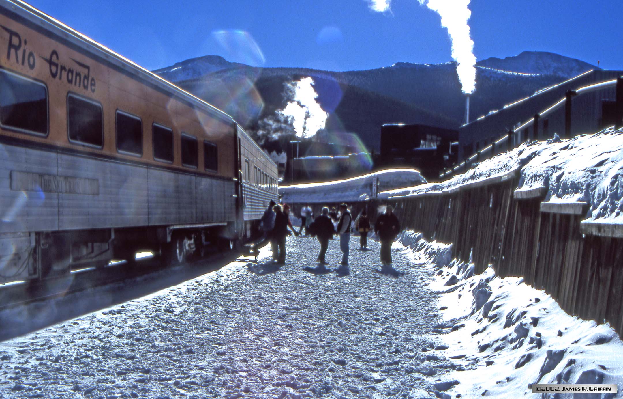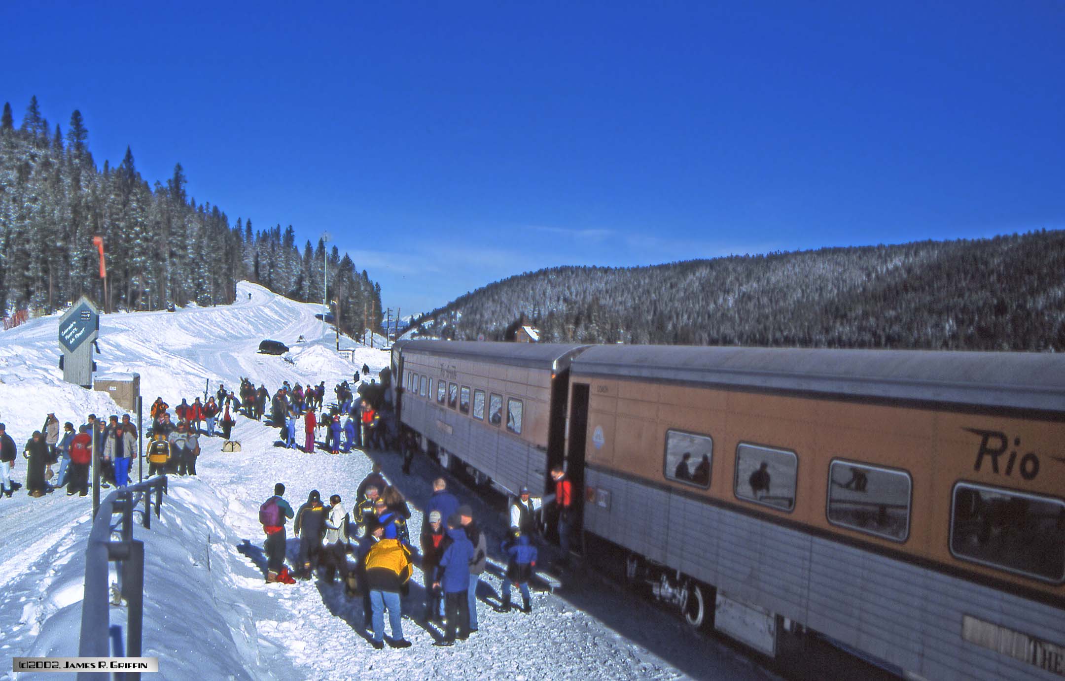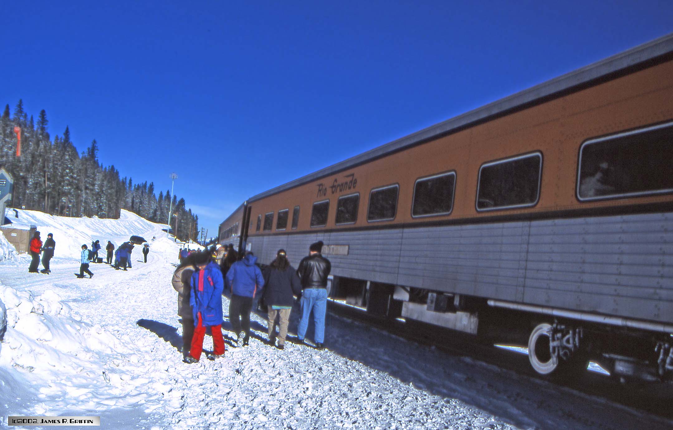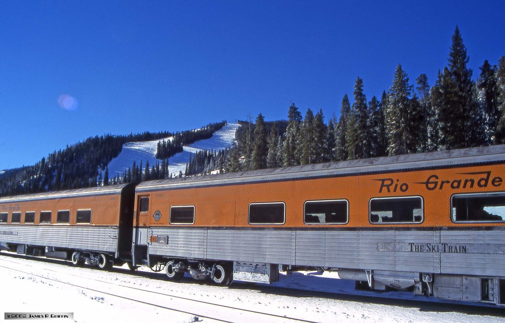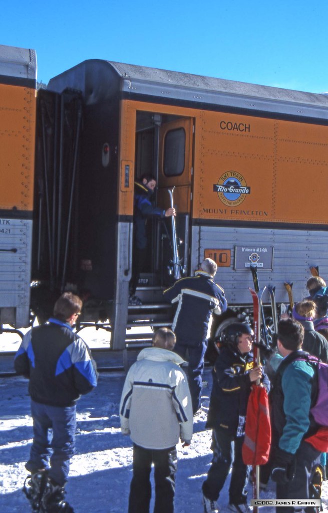 Here is the second installment of Ski Train photos from my archives. The date was February 10th 2002, and I was in the throes of writing a book on the Rio Grande railroad. Accordingly, since I viewed riding the Ski Train as an opportunity to get some imagery for the book, I loaded the camera with slide film instead of print film. Boy, what a difference!
