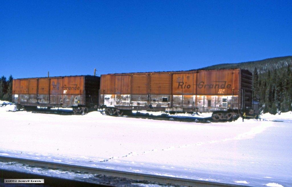 West Portal’s little maintenance siding, known as Crane Spur, was usually a place for the railroad to spot maintenance equipment. A pair of old Rio Grande boxcars had stood there for many years, serving mostly as portable sheds for the section crews. Here are two photos of the cars.