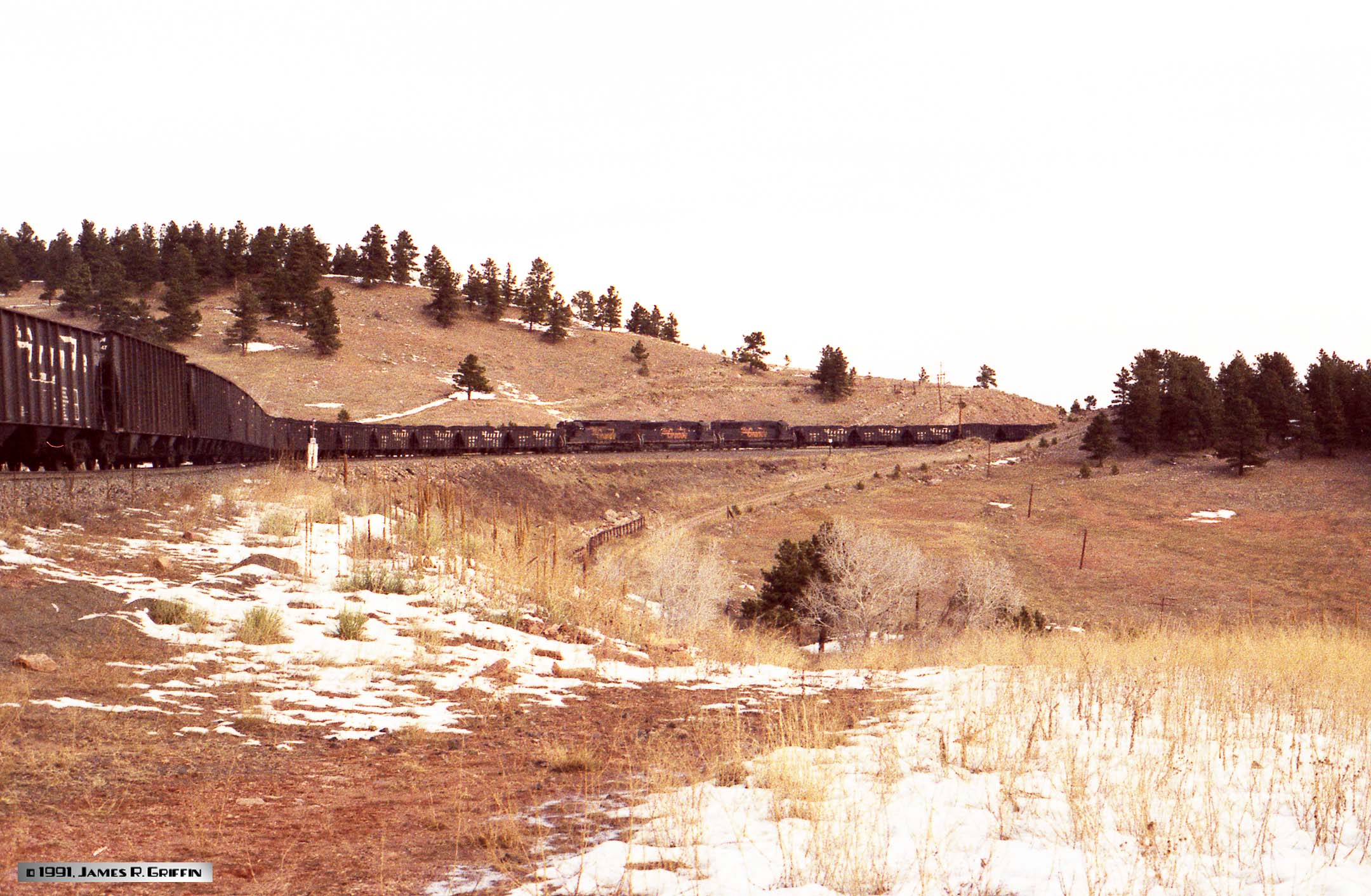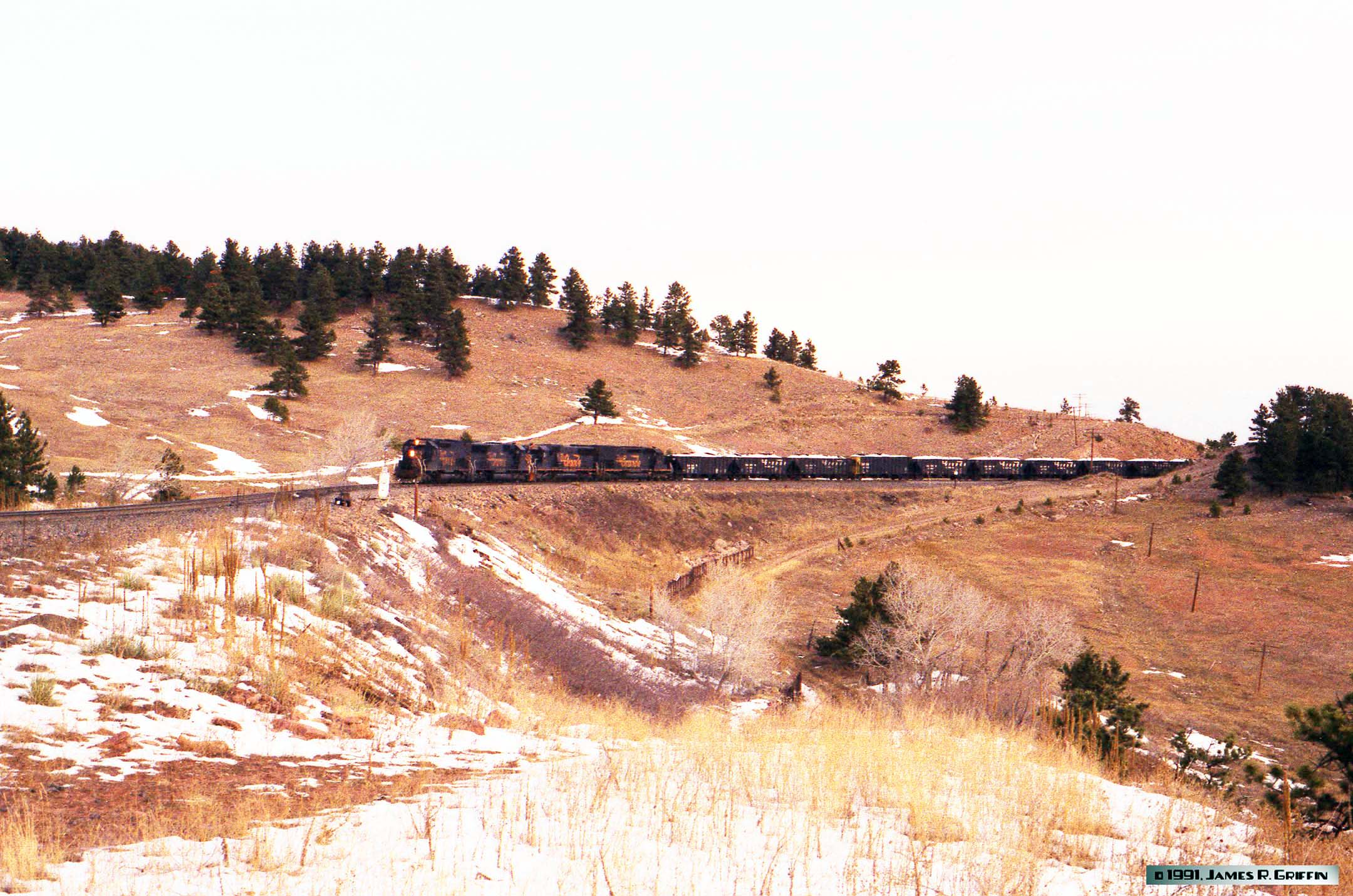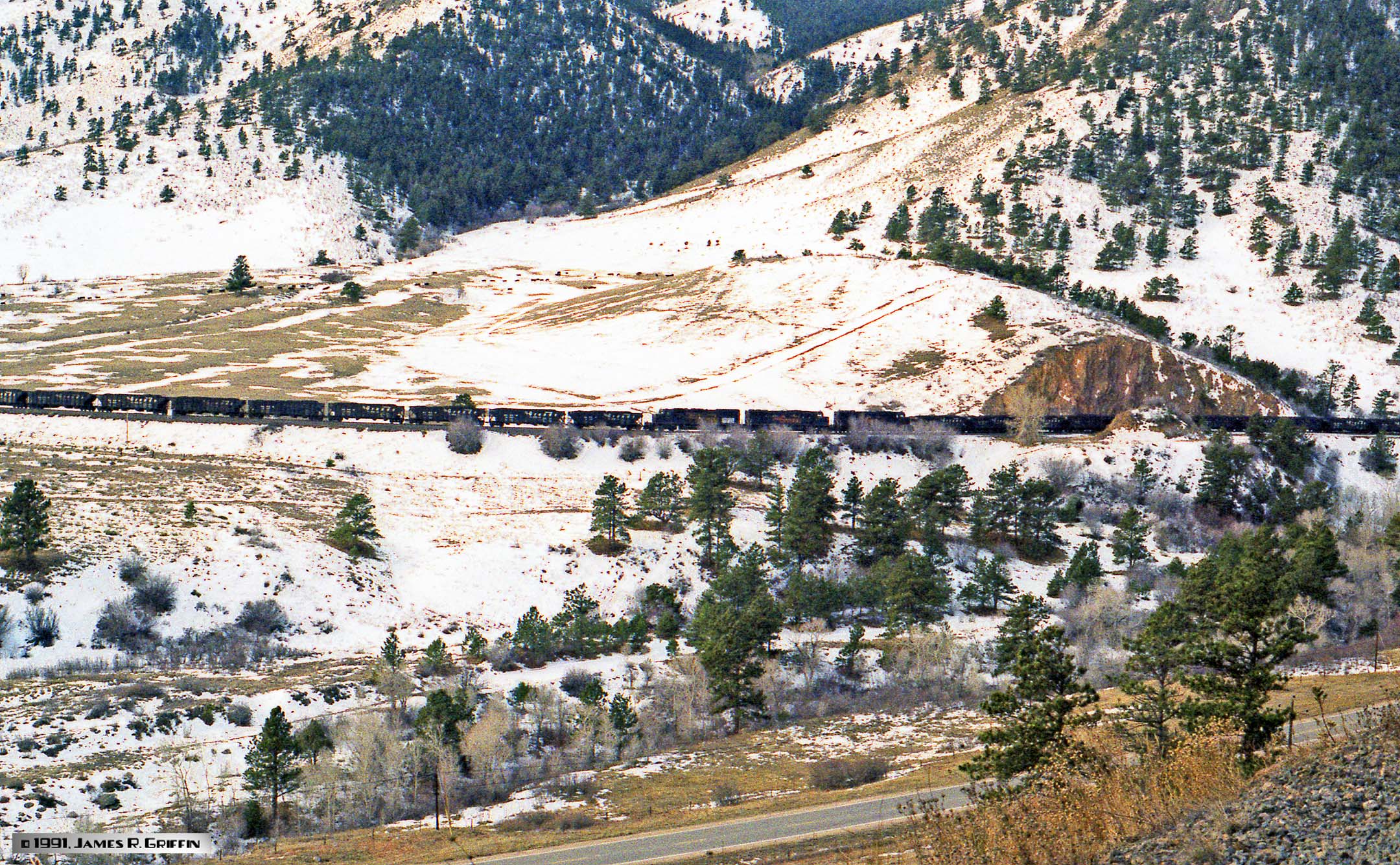 Four Rio Grande 6-axle diesels lead this eastbound coal train, consisting of about 105 loaded company hoppers. Note that the coal loads have a crest of snow; it’s not a flaw in the image!