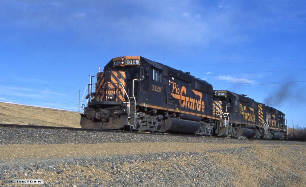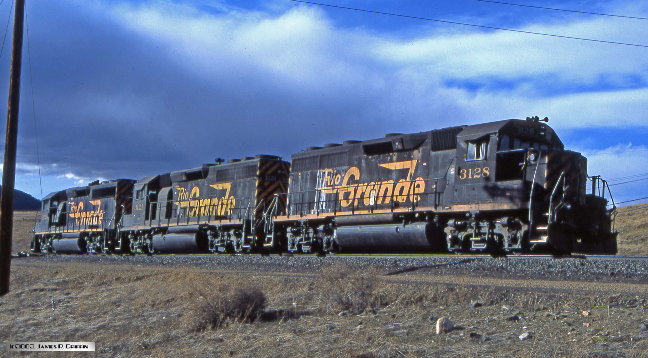 ABOVE: Rio Grande power on the West Local. This job switched the Rocky Aggregates plant on the spur at Rocky, west of Denver. It also switched a small petroleum customer a couple miles east, and years past also served the Rocky Flats weapons plant. Here, it’s a Union Pacific job in 2002 but these three Rio Grande units had the duty anyway. See my blog report on that day’s action.