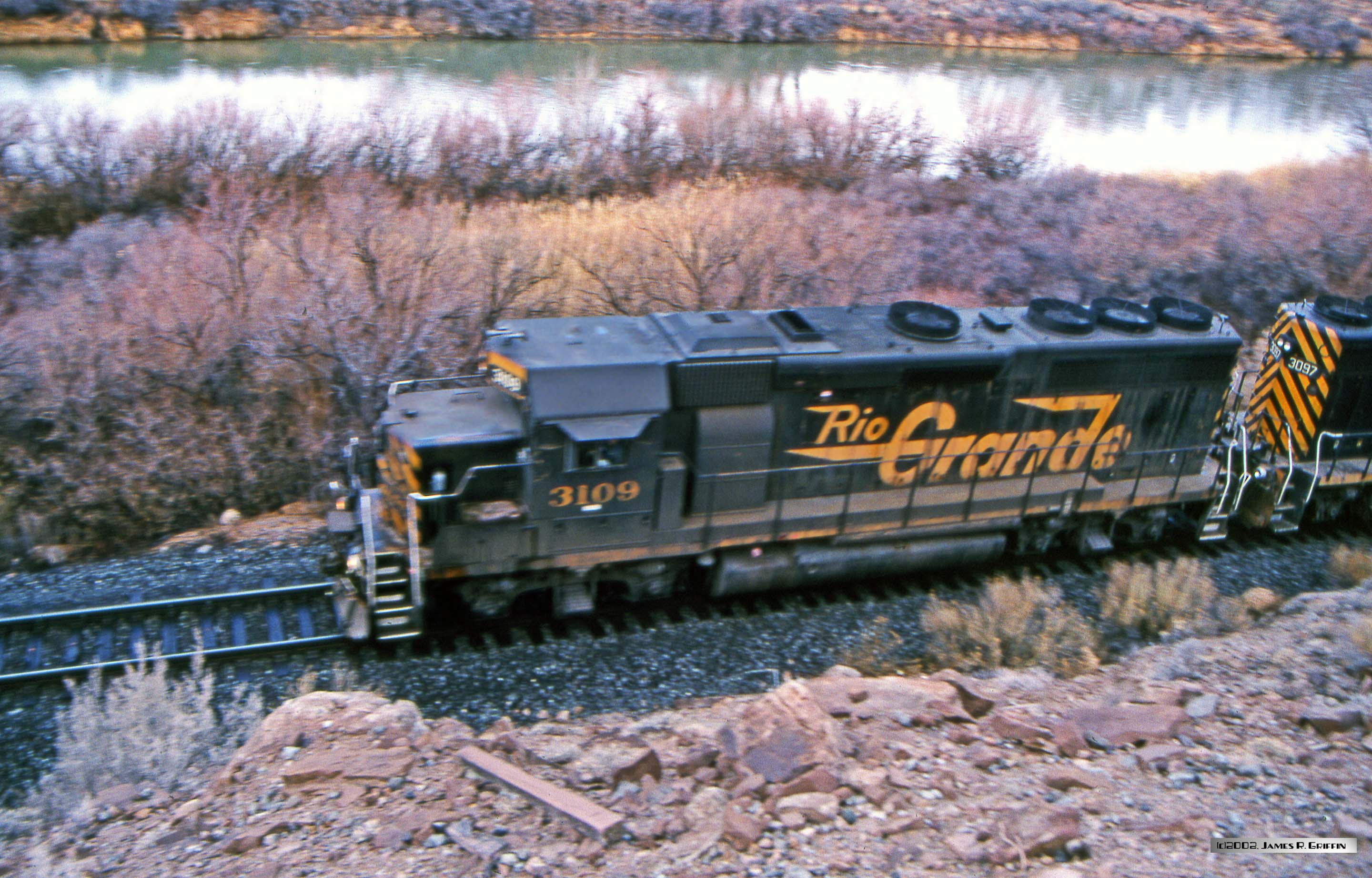 ABOVE: Going back to Rio Grande days, a local train has operated between Grand Junction and Minturn, serving customers between those points. After the Tennessee Pass line was shut down in August 1997 the Minturn Local’s range was cut back to Gypsum, but has continued to run. Here, the train is eastbound at Cameo on October 10, 2000, with a familiar pair of GP40-2’s for power. Nos. 3118 and 3109 had the honors that day. At other times this train has used a variety of 6-axle power as well, including some of the Rio Grande tunnel motors until they were superannuated. These days it’s more often a pair of UP SD70’s.