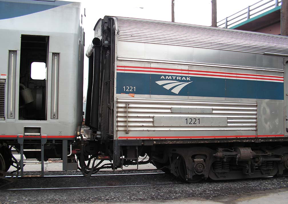 Close-up of the front end of baggage No. 1221, a fluted car from Budd. On Train No. 4 in Albuquerque, 2/7/2010. The back door to P42 No. 85 is open wide. |