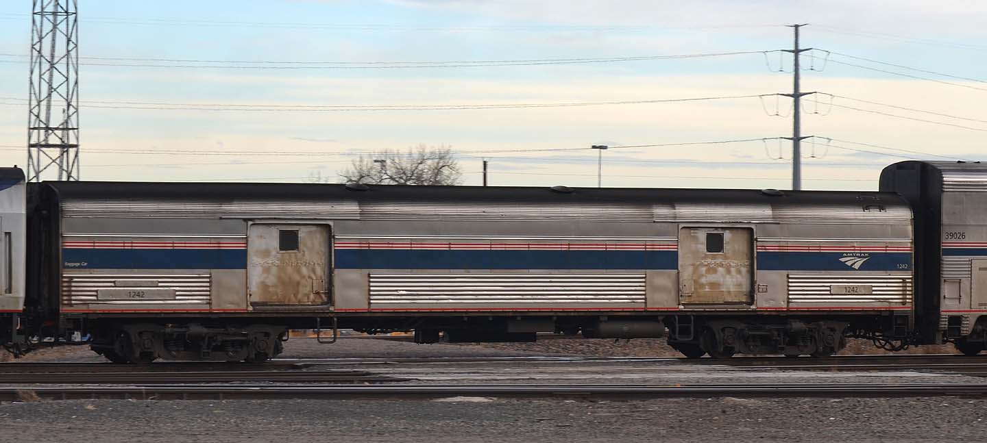 Baggage 1242, on train No. 5 leaving Denver on 12/16/2014.This car was originally built in 1953 by Budd for the AT&SF as car No. 3523. |