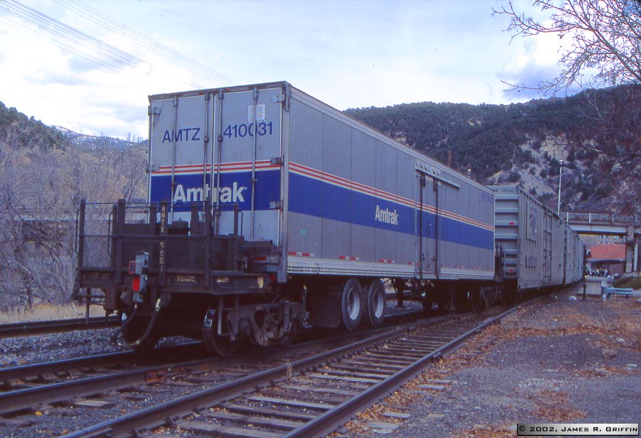 Roadrailer semi trailer, running on the tail end of No. 6 at Glenwood Springs in 2002. In front of the trailer is a string of material-handling cars, whose placement at the end of the train suggests that these cars are not fitted out for HEP, prohibiting their use ahead of the passenger cars. |