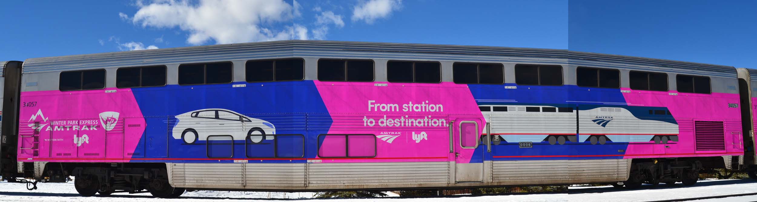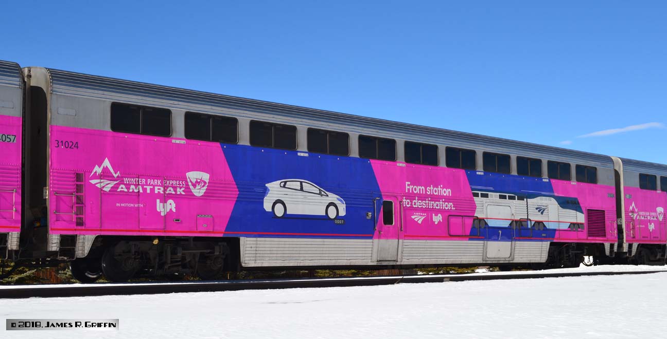 Coach/Baggage 31024, dressed in a Lyft ad-wrap for the Winter Park Express on 2/18/2018. This and two other cars were so adorned for the 2018 season. |