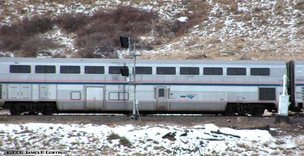 Transition sleeper 39028, westbound in Byers Canyon on 8/9/2007. This was the first time I had photographed the newer, simplified Phase IVb scheme. Note the lack of the scripted “SUPERLINER” lettering, and modified numbering and car identification legends. |