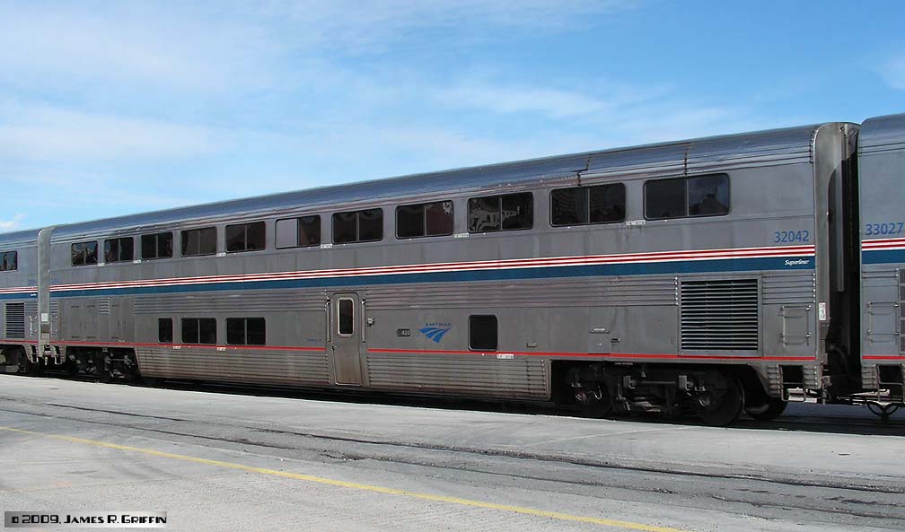 | Coaches and coach/baggage cars are in the following number series. S1 Coaches: 34000-34101 S2 Coaches: 34102-34139 S1 Coach/Baggages: 31000-31047. (However, when smoking began to be restricted on Amtrak trains, these cars were re-designated as Coach/Smokers. The lower levels had glass installed in the window openings and a few inexpensive seats were installed. During the time these cars were configured as such, they were renumbered into the 31500 series [changed the middle digit in the number]. After this conversion was undone, the cars reverted to their original numbers.) |