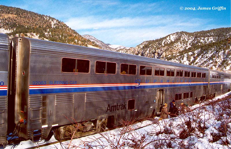 Transition Sleeper 39019. Look closely at the far end of the car and you will see a small window on the end. These cars have a standard-height vestibule on that end, allowing passage into the baggage car (or other standard-height equipment). Wearing Phase IV lettering. (Glenwood Springs, 1/1/2004) |