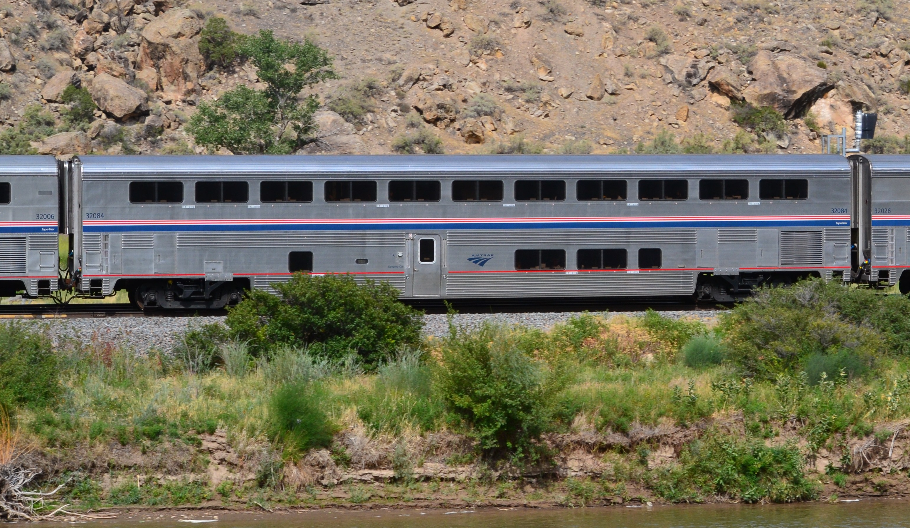 S1 Sleeper 32044 brings up the markers on No. 5 at Westwater, Utah (4/27/2014). Oblique angle but we get a good look at the end of the car.This particular run featured (in order) a transition sleeper at the head end, two coaches, lounge, diner, and these two sleepers on the tail. |
