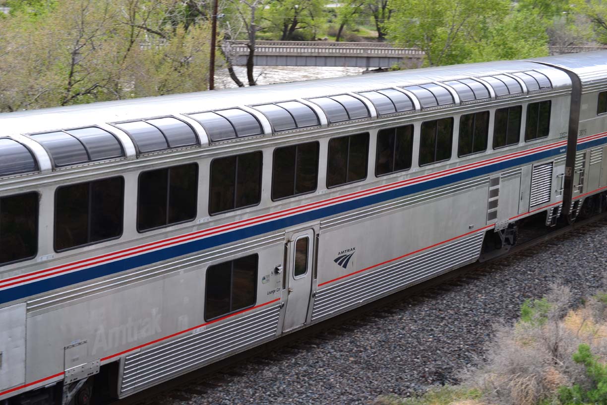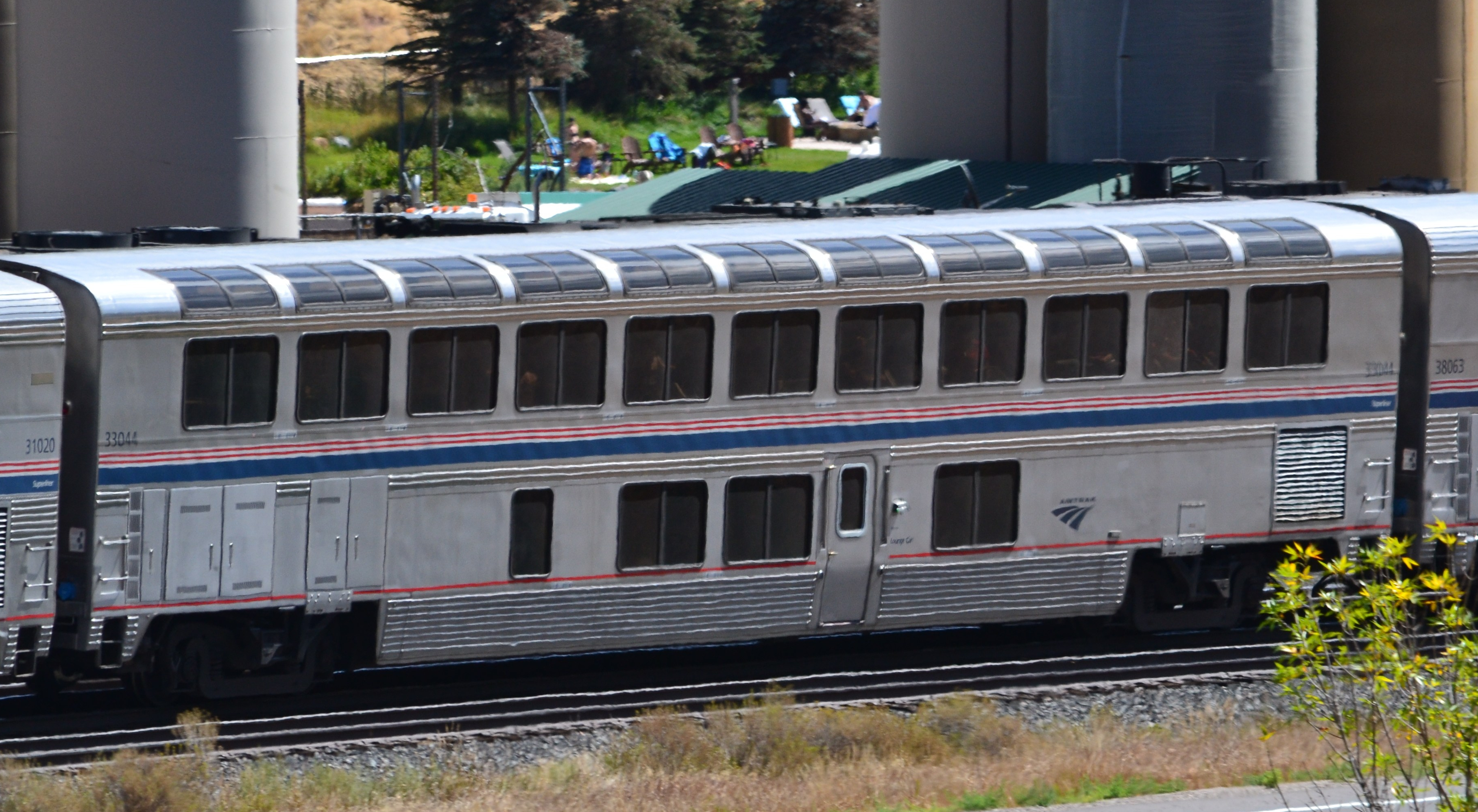 S1 Sightseer Lounge car 33013, at Glenwood Springs on No. 6 (8/07/2001). These cars are the best place to be for the scenic portions of a trip, particularly in Colorado’s canyon country. Phase IV paint. |