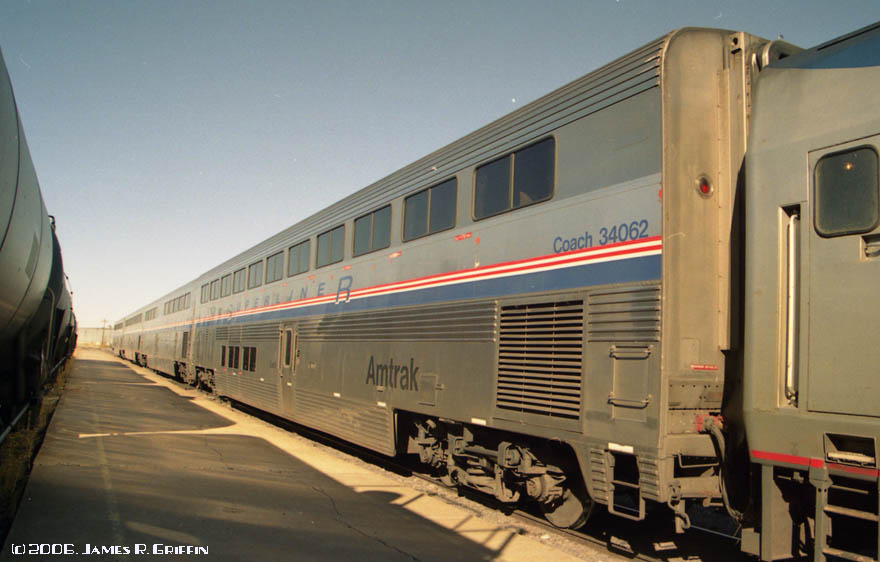 S1 Coach No. 34062 is seen on the California Zephyr at Grand Junction, CO on 1/05/2006. On this day the train was being run as a stub operation west of Denver, turning at Grand Junction, and as such was run without sleepers, baggage car, or lounge. Three coaches and a diner behind two P42DC’s were the entire train. The announced reason was because of flooding in California, although why they didn’t run through to Salt Lake was not explained to me. |