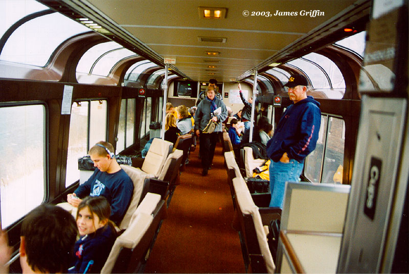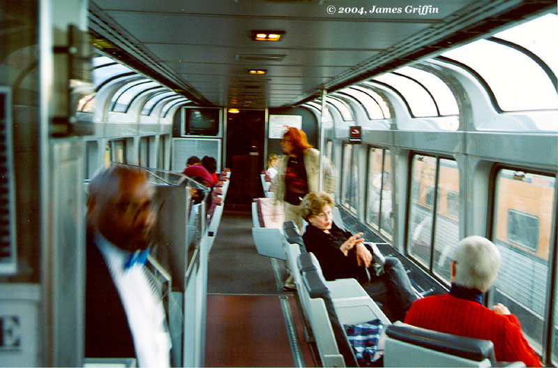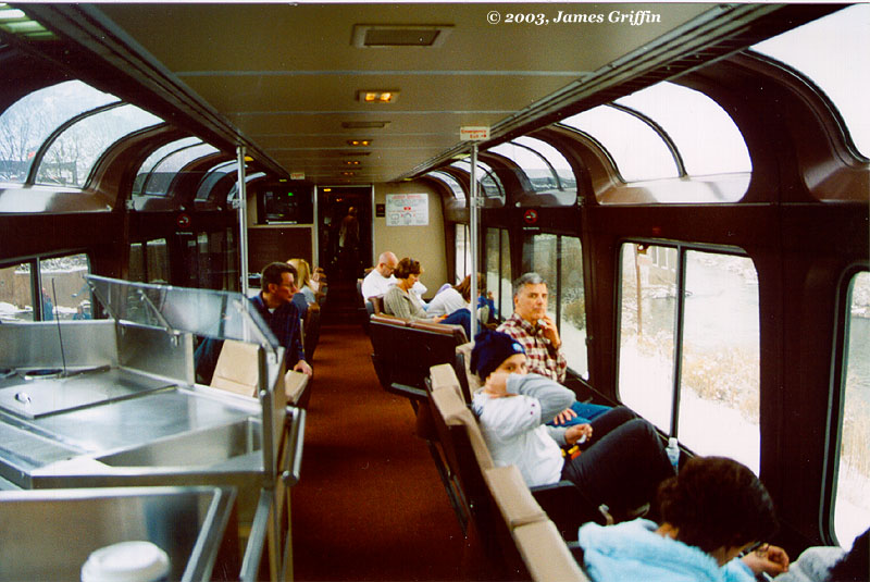 | Interior of a Superliner II Sightseer Lounge car, upper level. The steward at left is coming up the staircase. Yes, that’s the Ski Train visible out the right-hand windows; photo taken at Denver Union Station. | ![]() |