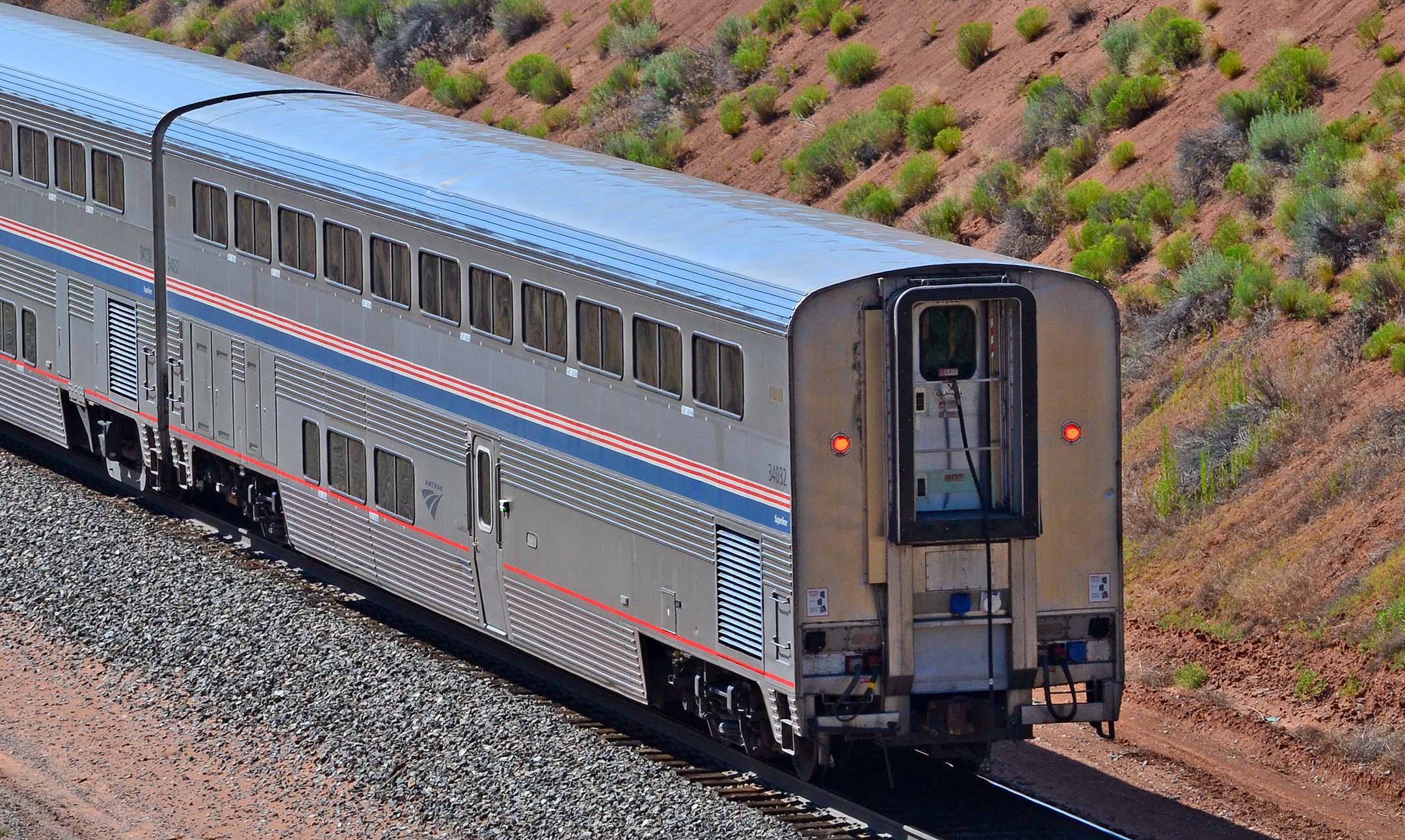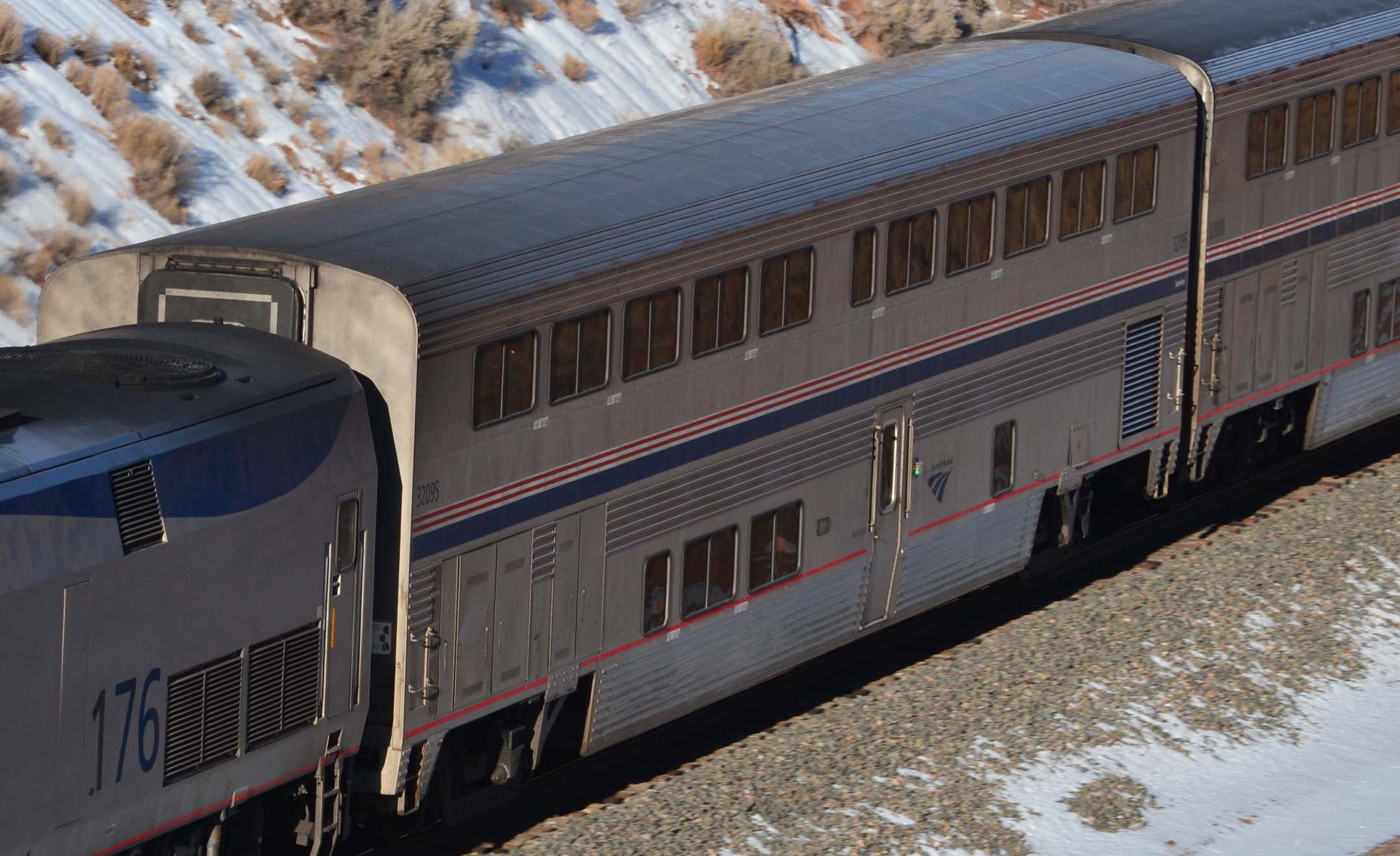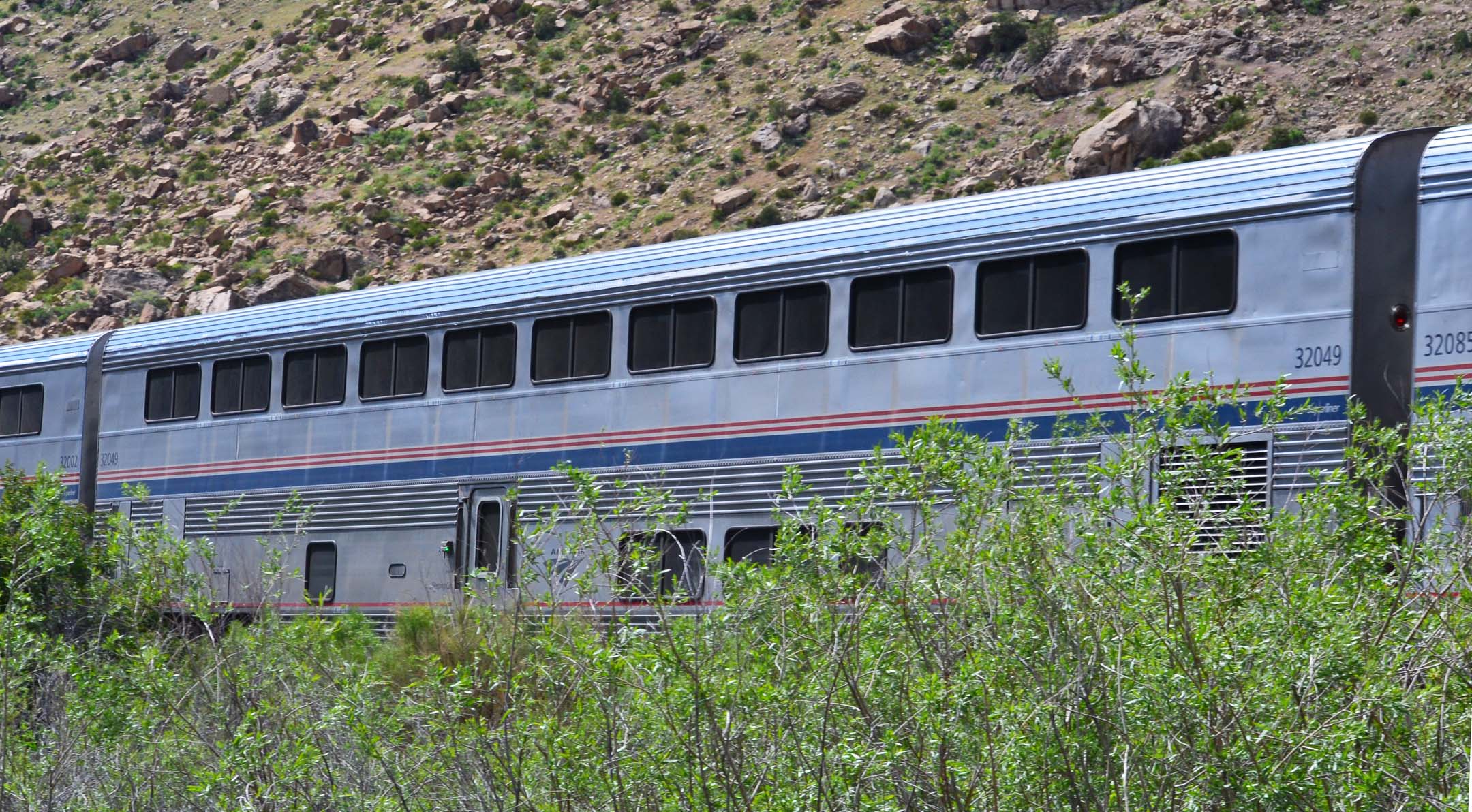 Transition sleeper 39035, at Westwater, Utah on 4/27/2014. This consist was inverted, with coaches behind the transition car, and only 7 cars total. |