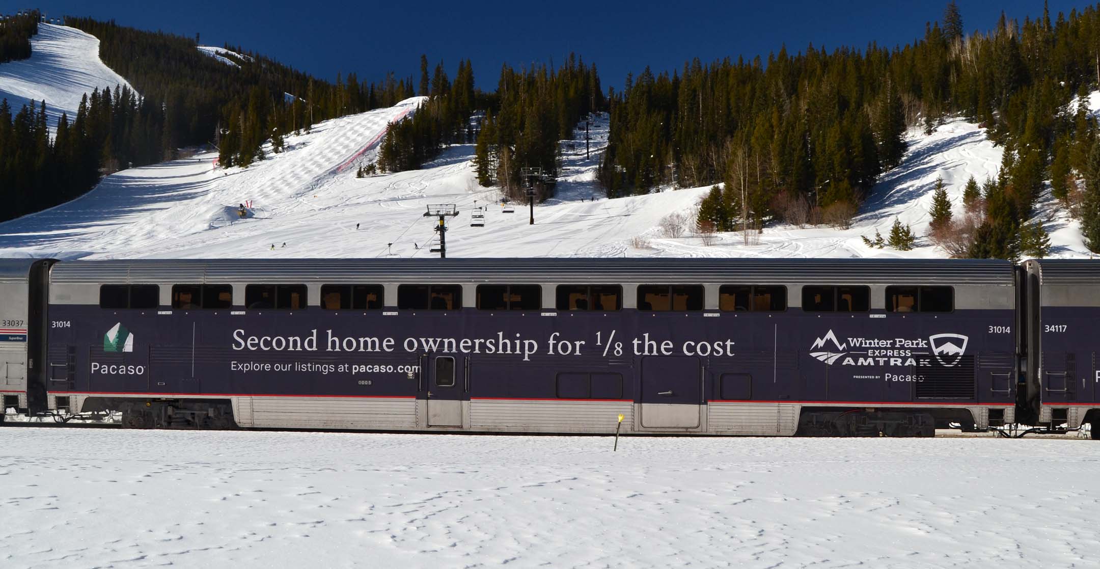 S2 coach 34137, ad-wrapped for the 2018 Winter Park Express. At Fraser, Colorado on 2/18/2018. |