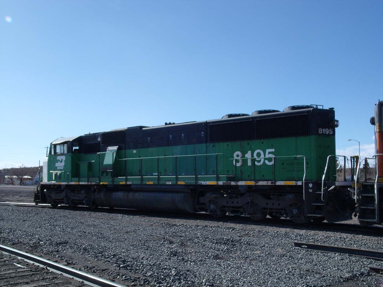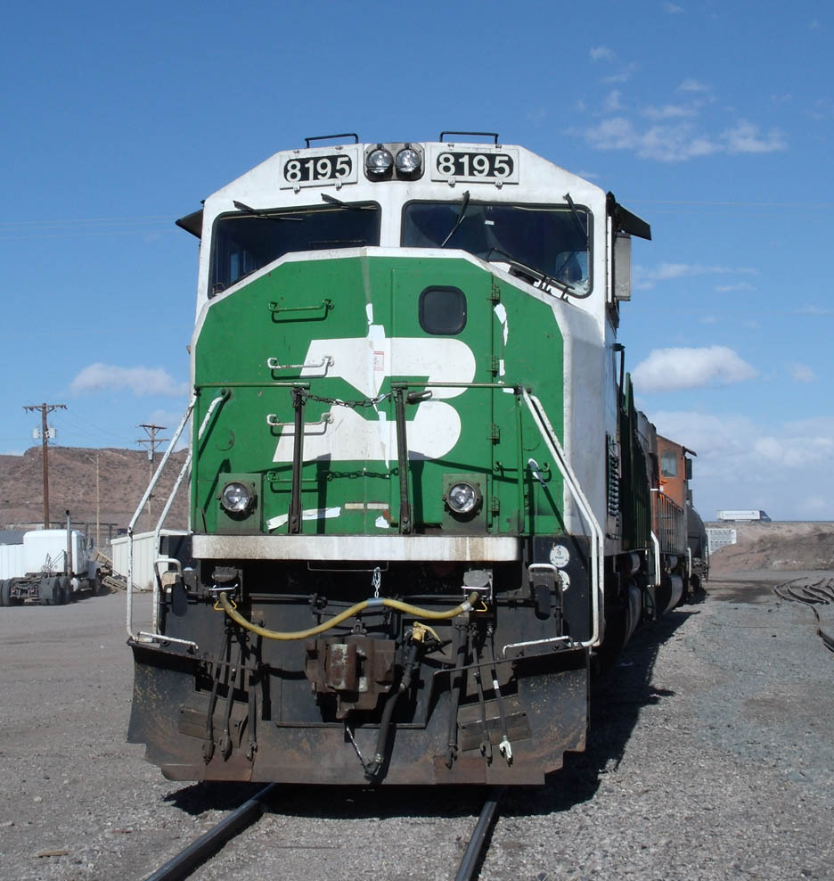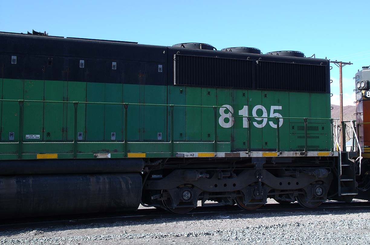 Captured at Rincon, NM on 2/24/2013:BNSF SD60M No. 8195. This is the former BN 9295, renumbered circa 2007/8 but still largely as it originally appeared.Second: Broadside view of the right side. Here we see the addition of the yellow Scotchlite stripes, common on contemporary BNSF locomotives.Third: 3/4 view from the left rear.Fourth: The left flank. Look closely and you can see where the first two digits were changed (a painted green square and new white numerals neatly applied– unlike No. 8103 above).Fifth: Left front detail. Main changes here are the removal of “BURLINGTON NORTHERN’ under the logo, replaced with the BNSF initials. Also look carefully at the white panel- you can see where the flag has been removed and the paint touched-up.Sixth: Full left-front 3/4 view.Bottom: Nose shot: this was the only angle on this day that had direct light! She still looks pretty good after more than 20 years of service. |