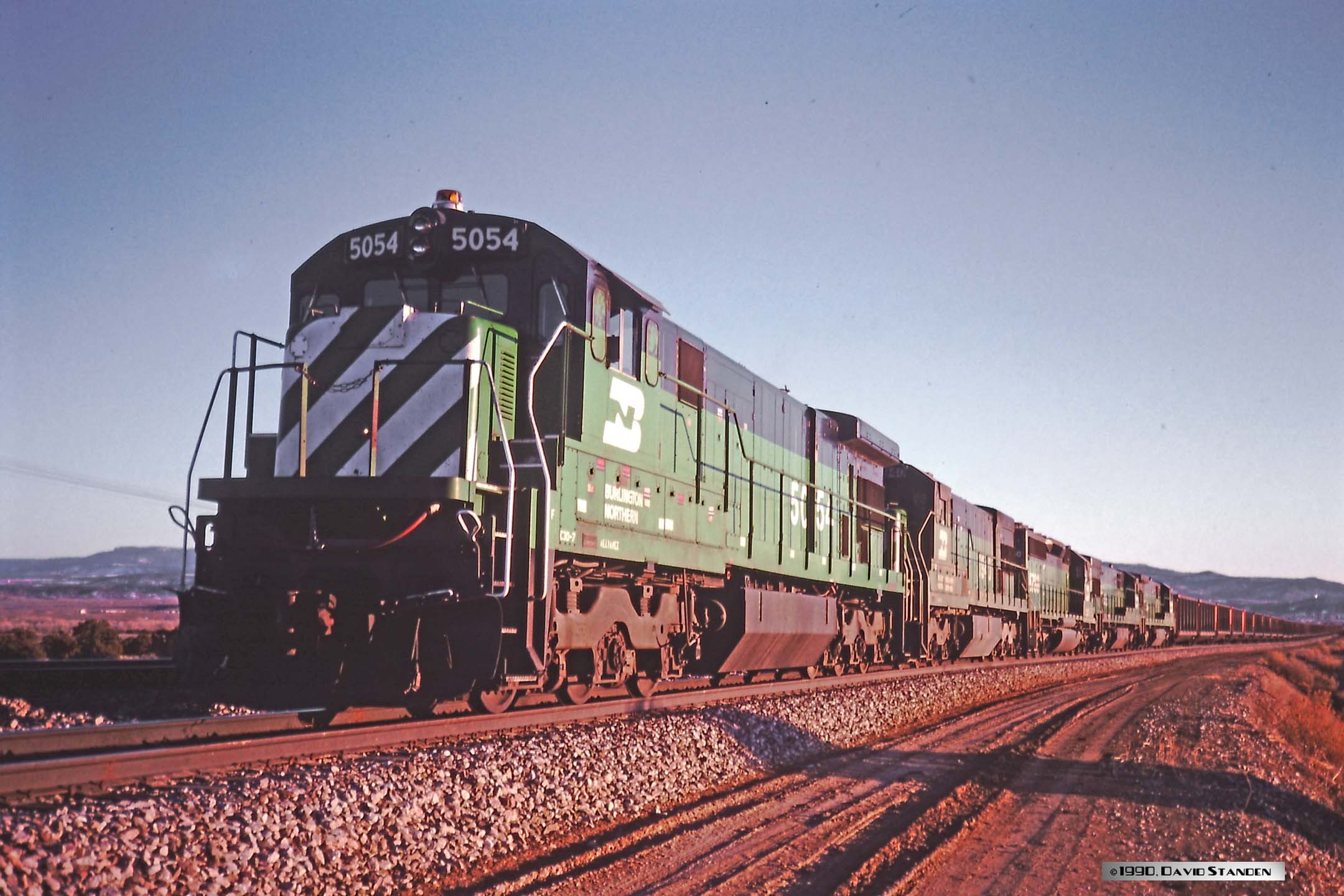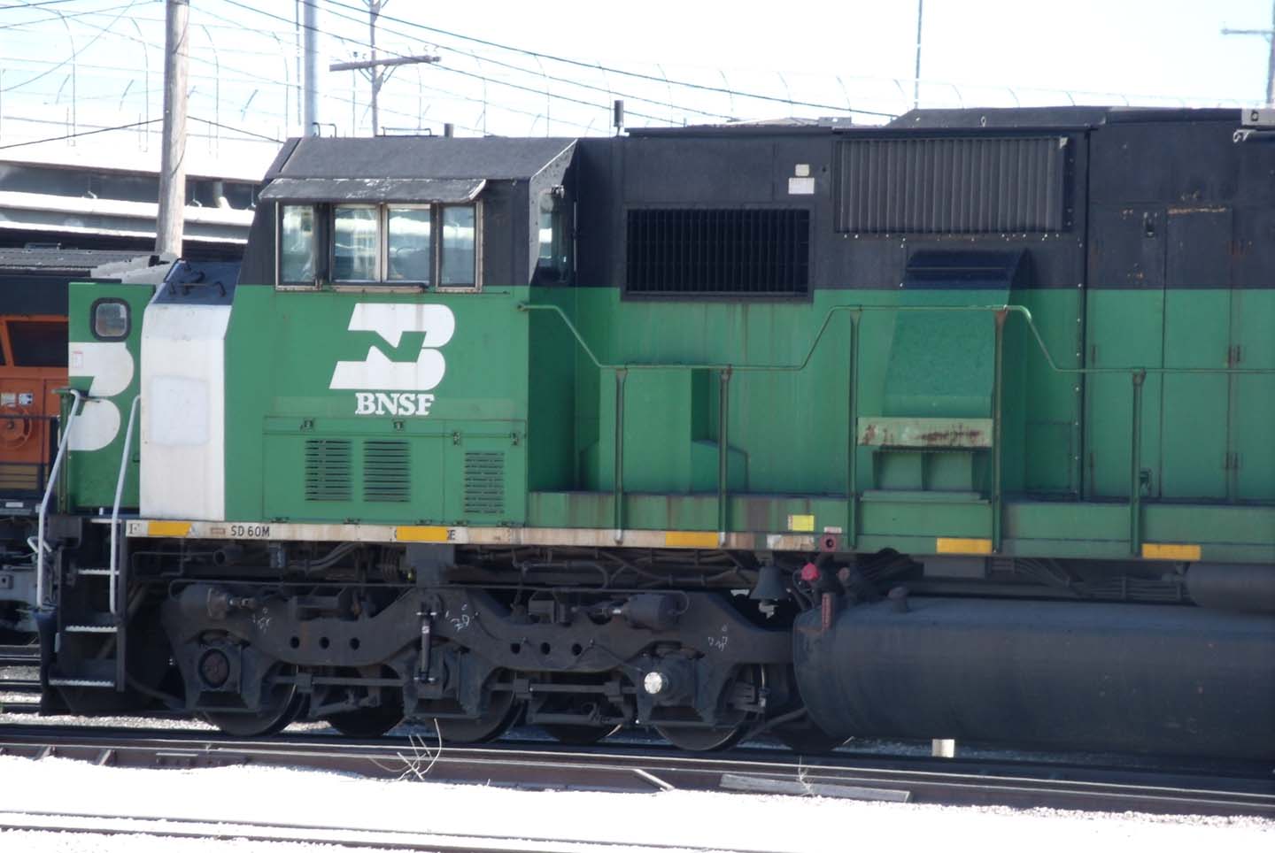 | The BN’s fleet of SD60M’s came in two orders. Nos. 9200-9249 were delivered between Dec. 1989 and Mar. 1990 and had the “triclops” cab, vertical cab face with three windows. The second group, 9250-9298, were delivered between Jan and Mar 1991 and had the two-window sloped cab face. All were renumbered by BNSF from the 9200 series into the 8100 series, in sequential order– making identification simpler. (Circa 2014 they were moved into the 1400 series, not in order, and have now being retired or rebuilt/repainted by BNSF). I am rather a fan of these beasts, and have a pretty extensive selection of photos of them below. |