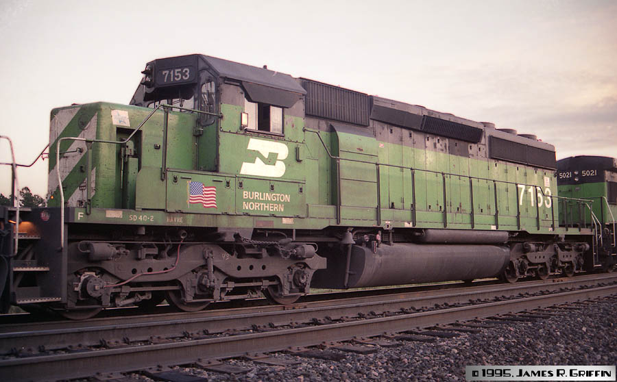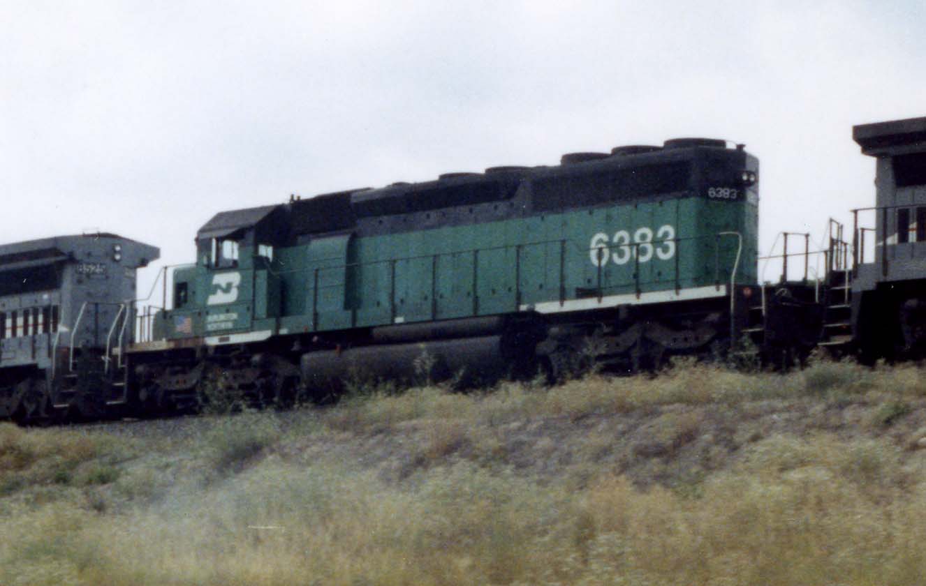 SD40-2 No. 7153 was the second unit on a northbound train at the Air Force Academy in September 1995. It’s a typical BN unit– the line had over eight hundred of these. Photo is just months after the BNSF merger. Note the flag and other lettering on cab. |