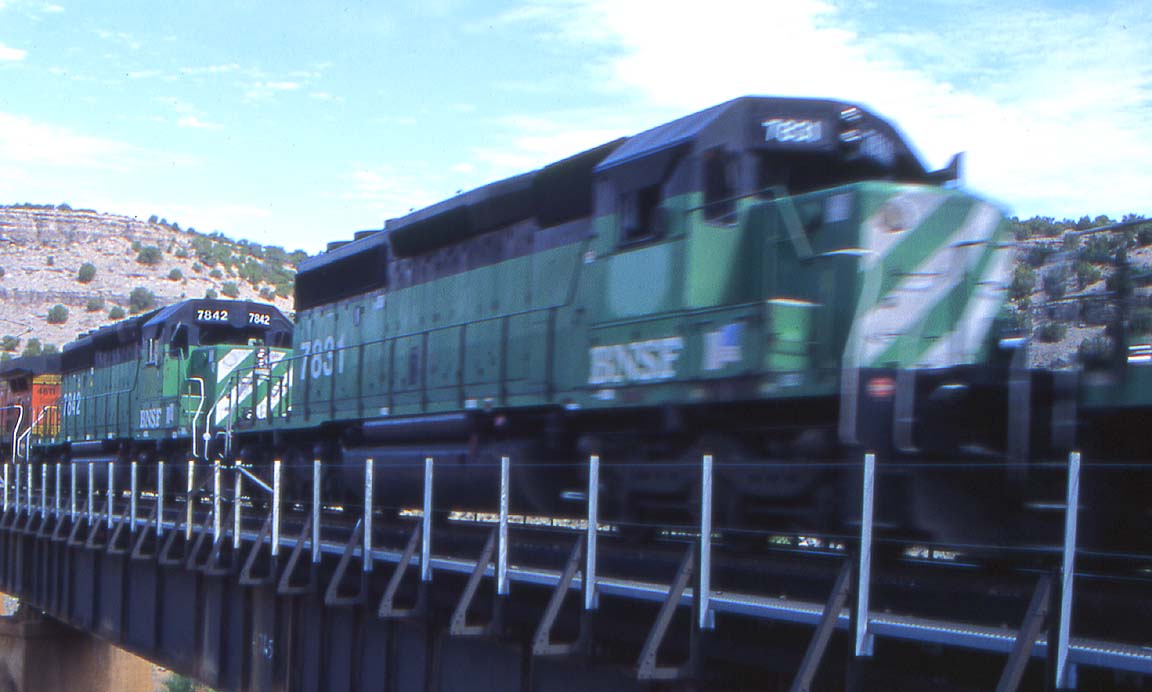 Two sister SD40-2’s, 7831 and 7842 (both now lettered for BNSF), are rolling down through Abo Canyon east of Belen, NM in June 2002. Just out of the photo to the right is a cabless B30-7 in BN colors. |