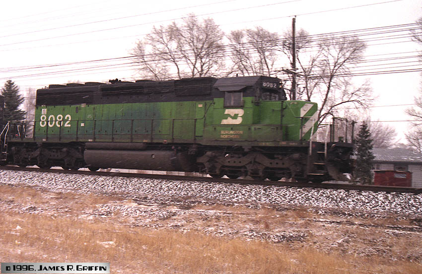 SD40-2 No. 8082, leading a southbound freight through Fountain on 2/24/1996.Built Aug 1979. |