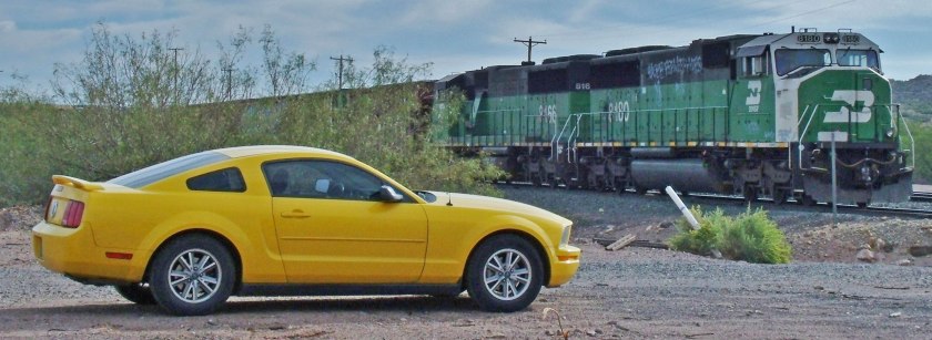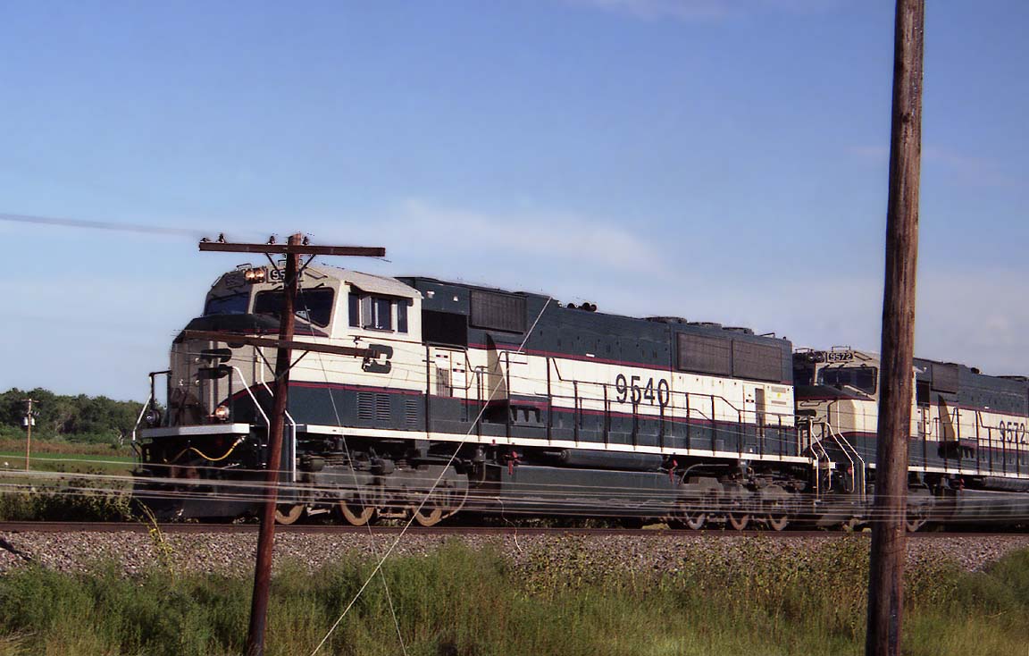 Nominated as one of my Worst Photos Ever: SD70MAC No. 9540 and four mates lead a northbound coal empty on the Joint Line just north of the Pikes Peak Raceway on Sept. 14, 1995. This is just a couple of months past the merger. |