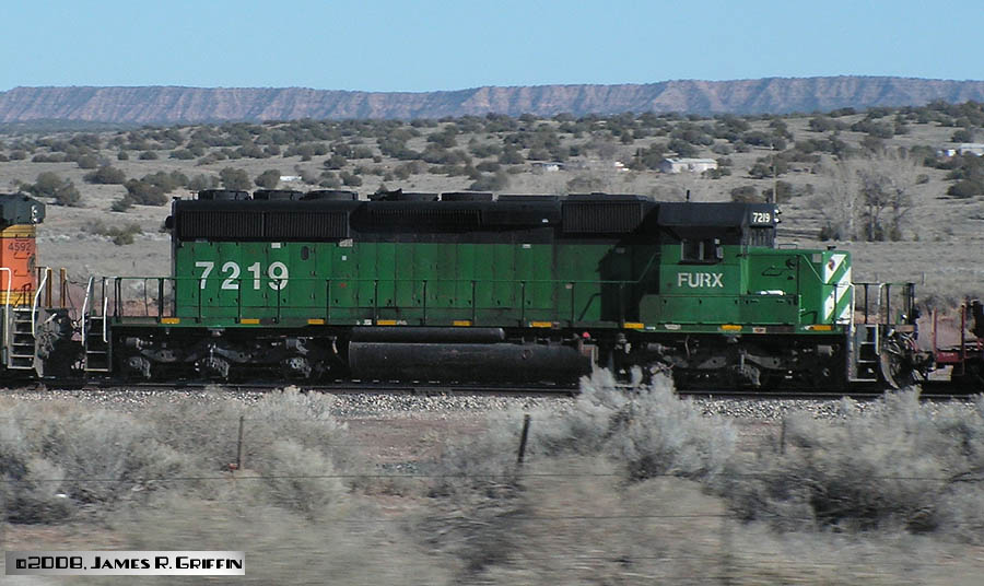 A repeat of the above, only further east. FURX SD40-2 No. 7219 is the trailing unit on a stack train, just west of the New Mexico-Arizona line. Nice to see these working front-line trains in 2008. |