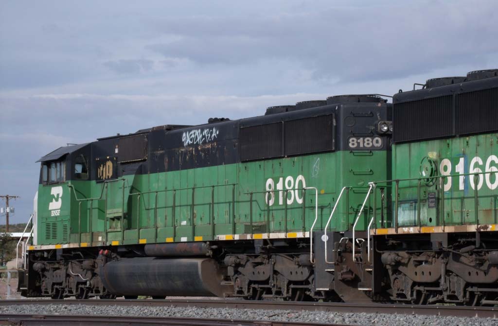 SD60M No. 8180 (former BN 9280), also at Rincon on 10/14/2013. It was on the point so I was able to get decent shots from all the important angles.Top: Here’s the engineer’s side 3/4, shadowy but enhanced.Second: Fireman’s side 3/4 view, with good sun!Third: Broadside from the left. This image is a little larger… Note the ambitious tagging job, up high.Bottom: Left rear flank.Unit was built for BN in February 1991. |