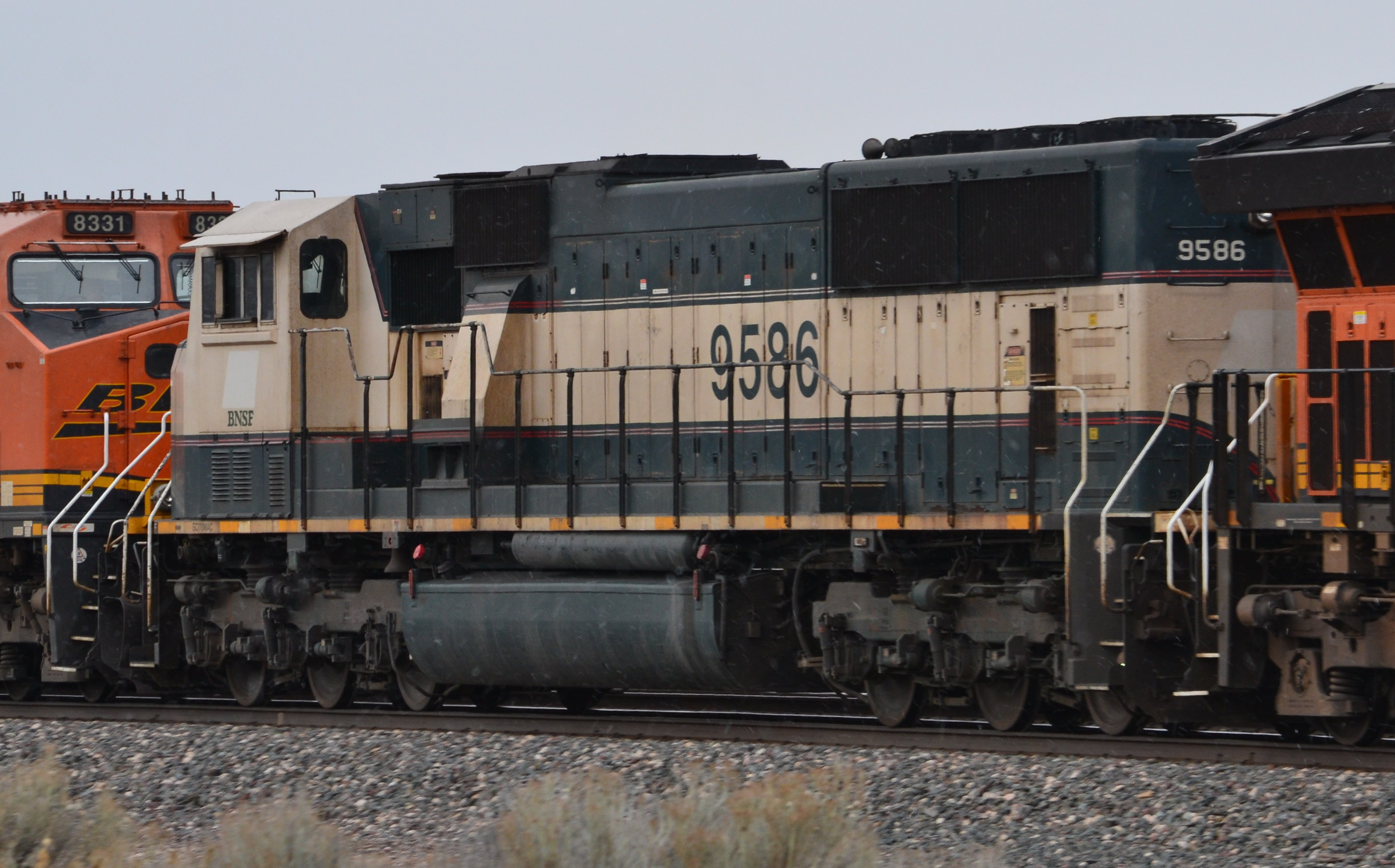 Former BN SD70MAC No. 9586. Look closely and you can see where the BN emblems were painted over on the cab and on the opposite end. Seen on the Transcon at Gallup on 1/19/2019. Full-size Image. (I never used to see Executive MAC’s on the Transcon but that has changed since around 2016.) |
