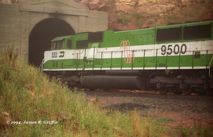 Three of the BN’s four SD60MAC test units are on the point of this coal train– an SPL coal train, that is– descending the Moffat line west of Denver in July 1994. Southern Pacific was evaluating the AC traction capabilities of these units. These were unique locomotives, having wide “safety” cabs with 3 windows across, AC traction motors, and a unique paint scheme.Below: Flank view of the leader No. 9500, showing the Siemens graphics. |