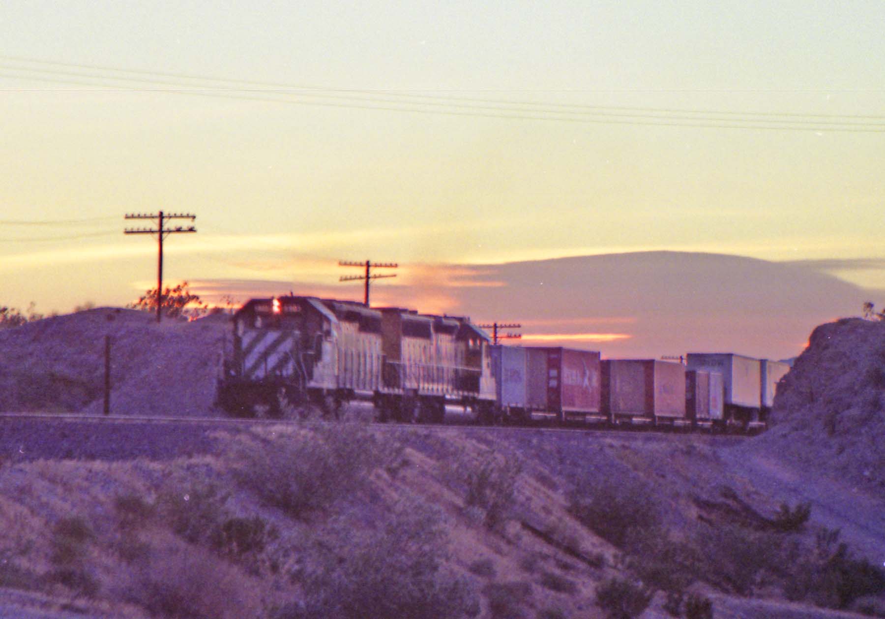 Here’s a dusk shot of SD40-2 No. 6381, leading an interesting mix of power up the grade from Needles, CA in May 1998. It has ditch lights now but carries its original number.There was another BN SD40-2 alumnus shoving on the rear of this doublestack train, number illegible unfortunately. |