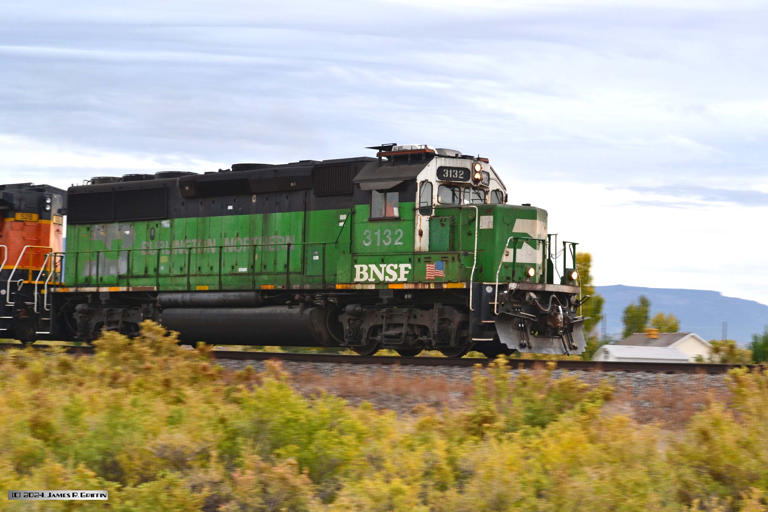 BNSF SD40-2 No. 1920, formerly BN 6913 (and before that, BN 6336) , is in Longmont, CO on 7/30/2011. It has no BN logos remaining on the sides, and just a tiny “BNSF” lettering on the cab. |