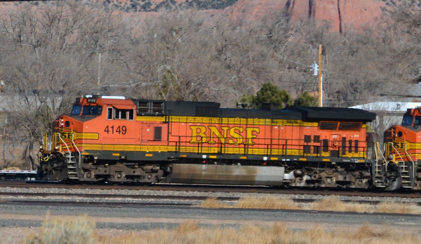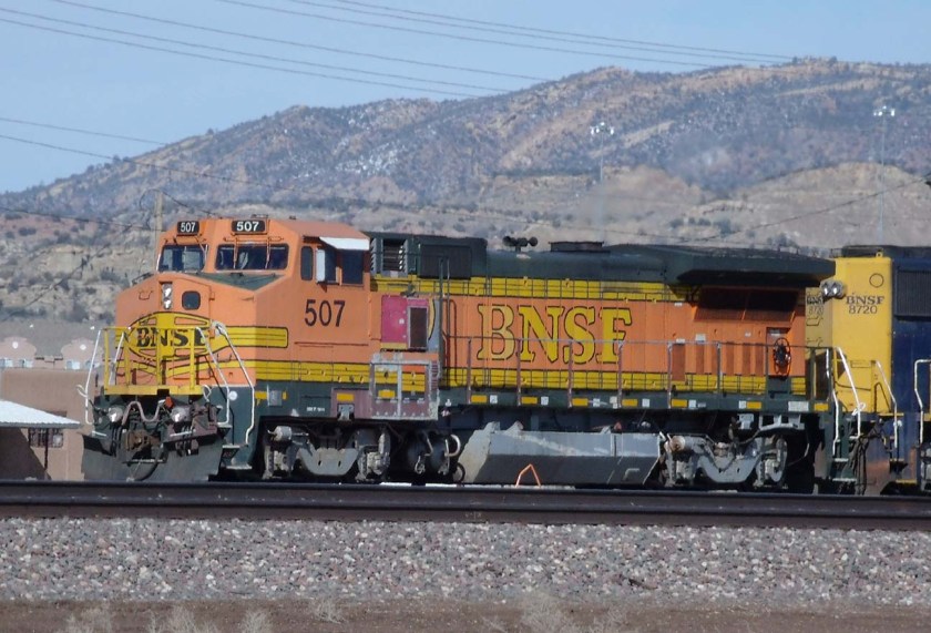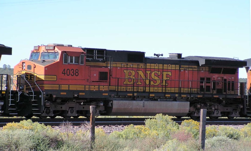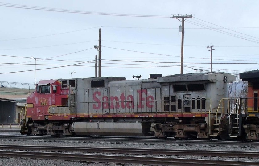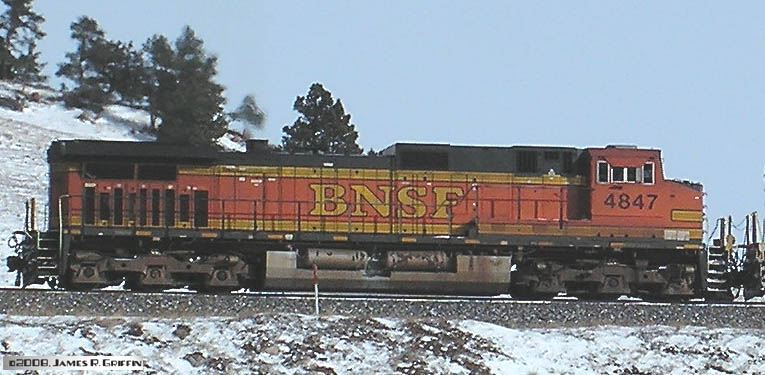No. 630, coming into Flagstaff from the west on 3/27/2008. Still in original Santa Fe paint, but note the missing letters on the side. Contrast the “BNSF” reporting marks with those on No. 629 above.Built February 1994. |