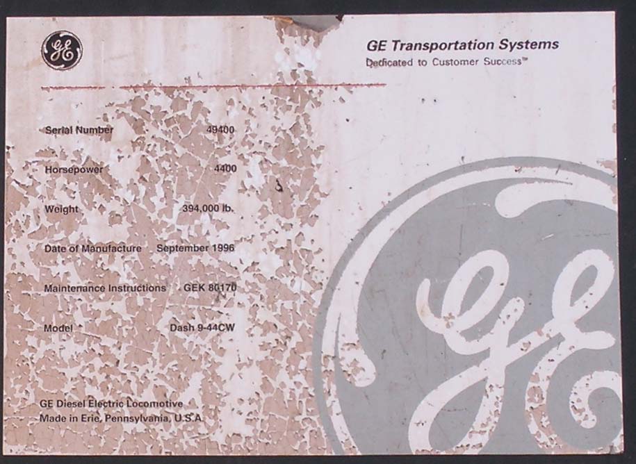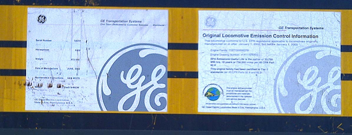 No. 4941, seen at the SWRR interchange at Rincon on 7/29/2916. This was an eastbound empty coal train. Sometimes one must walk up to one of these to truly appreciate how big they are.Here is the Builder’s Plate. Built November 1998. |