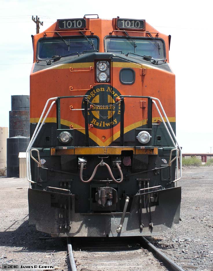No. 1010, tied up at Rincon, NM on 5/09/2010. Still in H1 paint, this unit was built in September 1996 (Not October 1996 as some sources state) and was one of the earlier units delivered in the orange H1 scheme.Middle: a nose-on portrait.Here is the builder’s plate on this locomotive.The Heritage-1 Dash-9’s had silver trucks and tanks. Contrast to the EMD H1 units and the B40-8’s shown above, which have green trucks and tanks.Bottom photo: Same unit, same place, different day (July 11, 2010). I loved the brooding clouds in this view, plus it shows off the long flank of the locomotive. Note also that the H1’s didn’t have the “wagon wheel” herald on the rear end, unlike the H2’s as shown here. |