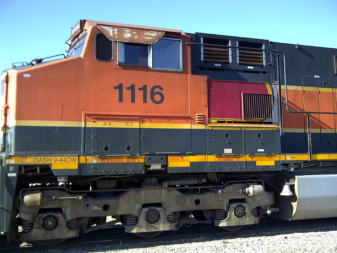 C44-9W Walkaround (Also referred to as a DASH 9-44CW)Here are four views of the former AT&SF No. 629, resting at Rincon on 9/07/2009. Still in original paint fifteen years after delivery (Feb 1994), it has the usual BNSF modifications: yellow sill stripes (FRA mandated), and “BNSF” lettered under the cab number.Note that the air conditioner has been swapped with one from an orange BNSF unit.These images are fairly large, to better show details. |