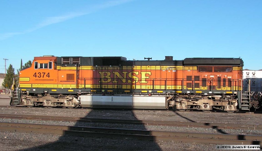 No. 4374, tied up at Rincon, NM on 12/13/2009– right in the shadow of the silo, unfortunately. The 4374 was built in March 1999. |