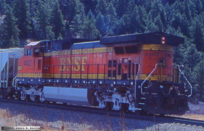 No. 4402, running as a DPU on the Moffat on 3/28/2002. Here is a nice shot of the back end. Though backlit, I’ve managed to adjust the light so it’s more visible. You can see the herald on the end, which on the H1 scheme had been on the nose instead. |